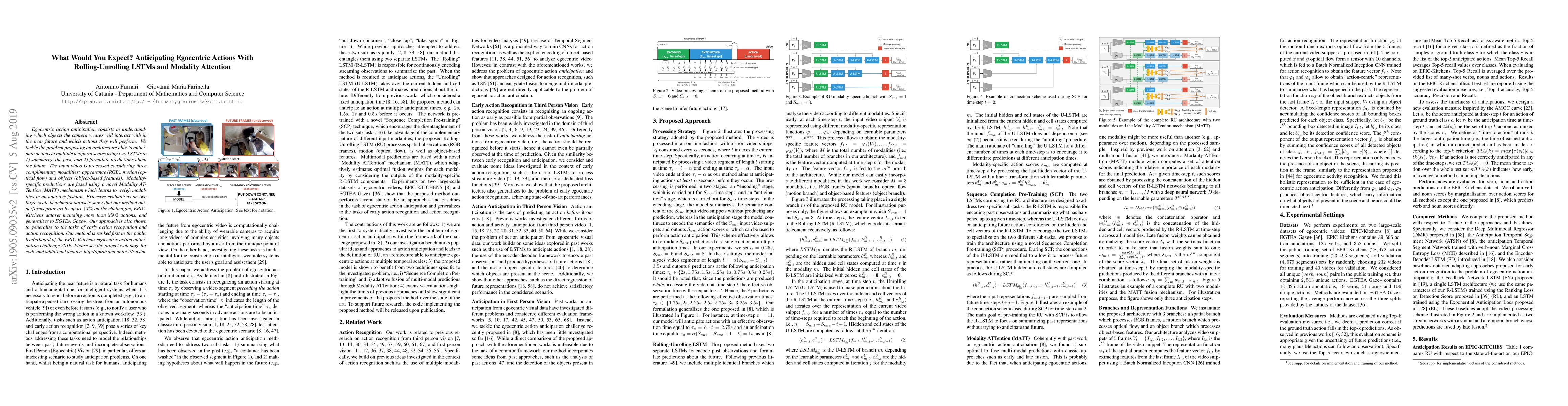 Egocentric action anticipation consists in understanding which objects the camera wearer will interact with in the near future and which actions they will perform. We tackle the problem proposing an architecture able to anticipate actions at multiple temporal scales using two LSTMs to 1) summarize the past, and 2) formulate predictions about the future. The input video is processed considering three complimentary modalities: appearance (RGB), motion (optical flow) and objects (object-based features). Modality-specific predictions are fused using a novel Modality ATTention (MATT) mechanism which learns to weigh modalities in an adaptive fashion. Extensive evaluations on two large-scale benchmark datasets show that our method outperforms prior art by up to +7% on the challenging EPIC-Kitchens dataset including more than 2500 actions, and generalizes to EGTEA Gaze+. Our approach is also shown to generalize to the tasks of early action recognition and action recognition. Our method is ranked first in the public leaderboard of the EPIC-Kitchens egocentric action anticipation challenge 2019. Please see our web pages for code and examples: http://iplab.dmi.unict.it/rulstm - https://github.com/fpv-iplab/rulstm.