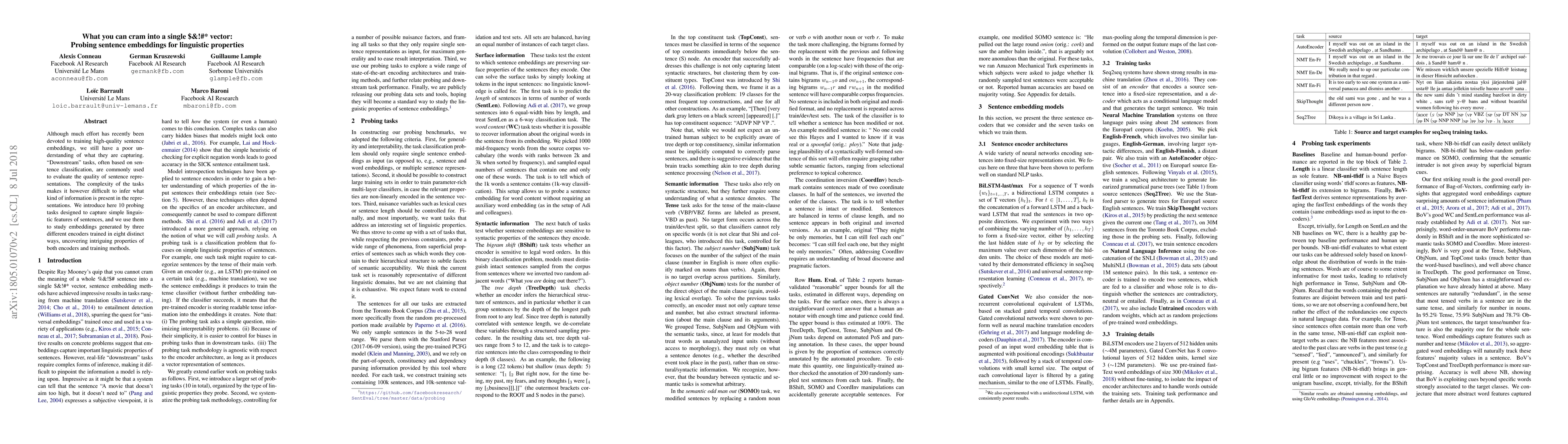 This paper introduces 10 probing tasks to better understand sentence embeddings' linguistic properties and analyzes embeddings from three encoders trained in eight different ways, revealing interesting insights about the representations' structure and training methods.