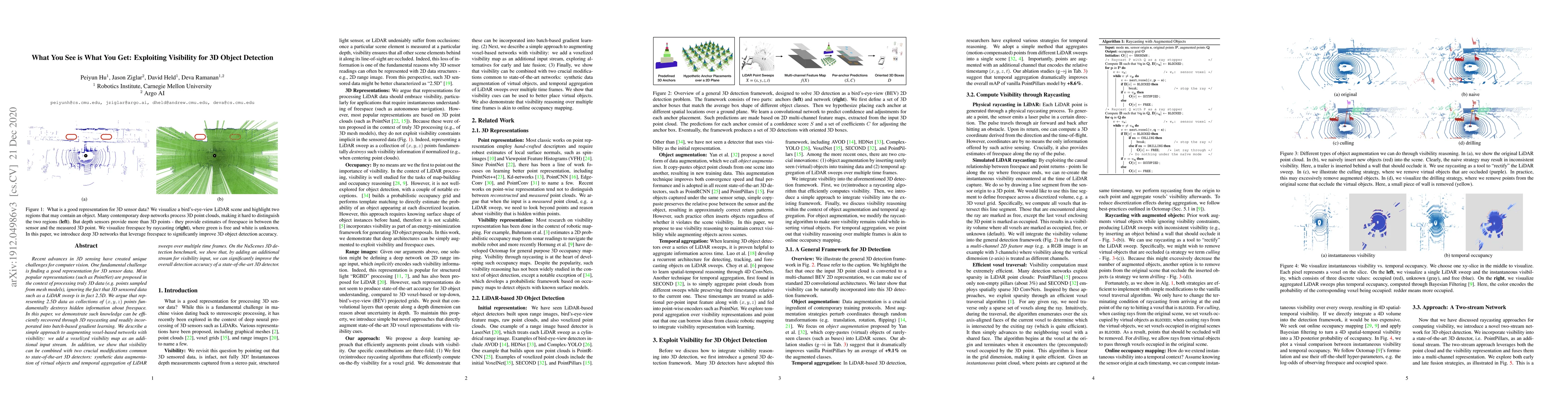 Recent advances in 3D sensing have created unique challenges for computer vision. One fundamental challenge is finding a good representation for 3D sensor data. Most popular representations (such as PointNet) are proposed in the context of processing truly 3D data (e.g. points sampled from mesh models), ignoring the fact that 3D sensored data such as a LiDAR sweep is in fact 2.5D. We argue that representing 2.5D data as collections of (x, y, z) points fundamentally destroys hidden information about freespace. In this paper, we demonstrate such knowledge can be efficiently recovered through 3D raycasting and readily incorporated into batch-based gradient learning. We describe a simple approach to augmenting voxel-based networks with visibility: we add a voxelized visibility map as an additional input stream. In addition, we show that visibility can be combined with two crucial modifications common to state-of-the-art 3D detectors: synthetic data augmentation of virtual objects and temporal aggregation of LiDAR sweeps over multiple time frames. On the NuScenes 3D detection benchmark, we show that, by adding an additional stream for visibility input, we can significantly improve the overall detection accuracy of a state-of-the-art 3D detector.