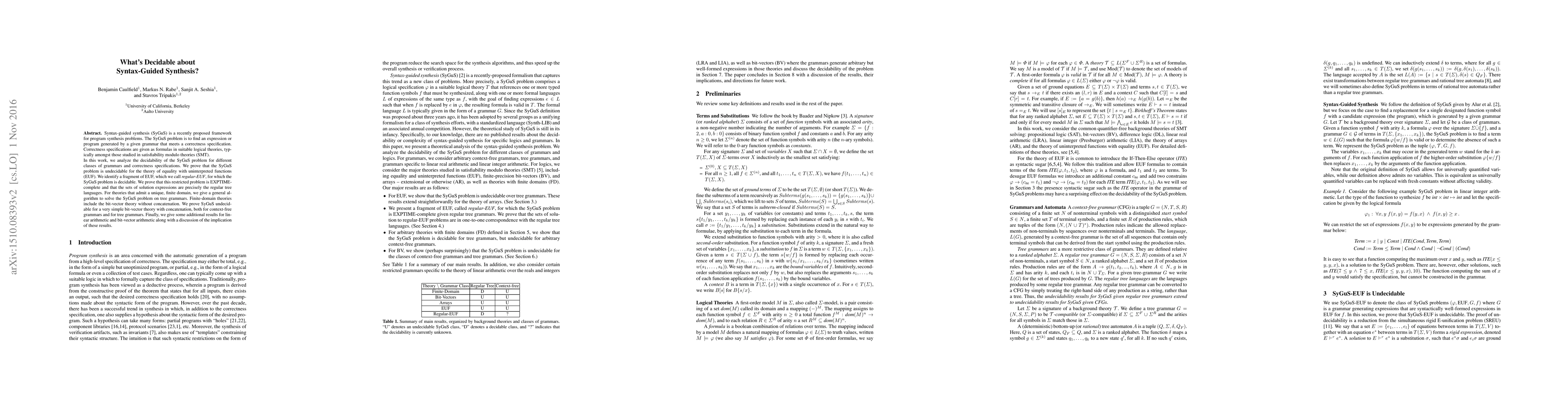 This paper explores the decidability of syntax-guided synthesis (SyGuS) for various grammars and correctness specifications, demonstrating that SyGuS is undecidable for the theory of equality with uninterpreted functions (EUF) but decidable for a restricted fragment called regular-EUF, which is EXPTIME-complete. For finite-domain theories, it presents a general algorithm for solving SyGuS on tree grammars.
