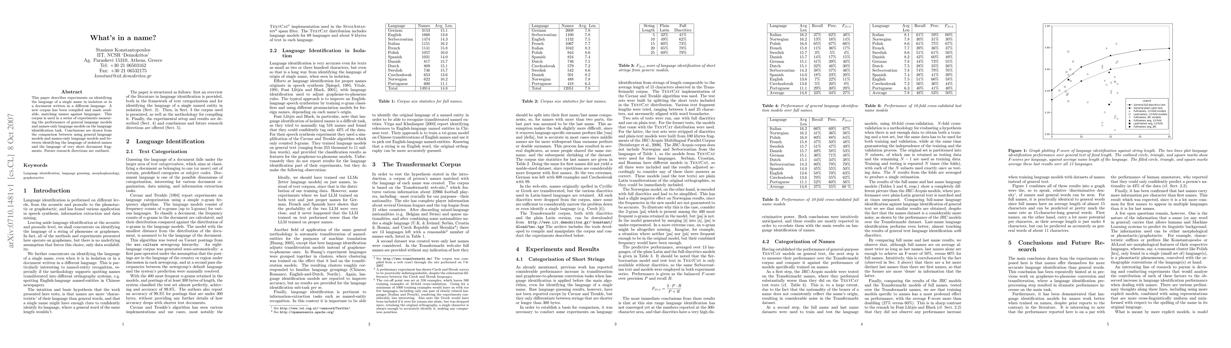 This paper experiments with identifying the language of single names using a newly compiled corpus and compares general language models with names-only language models, concluding that names-only models perform better for isolated names. Future research directions are suggested based on these findings.