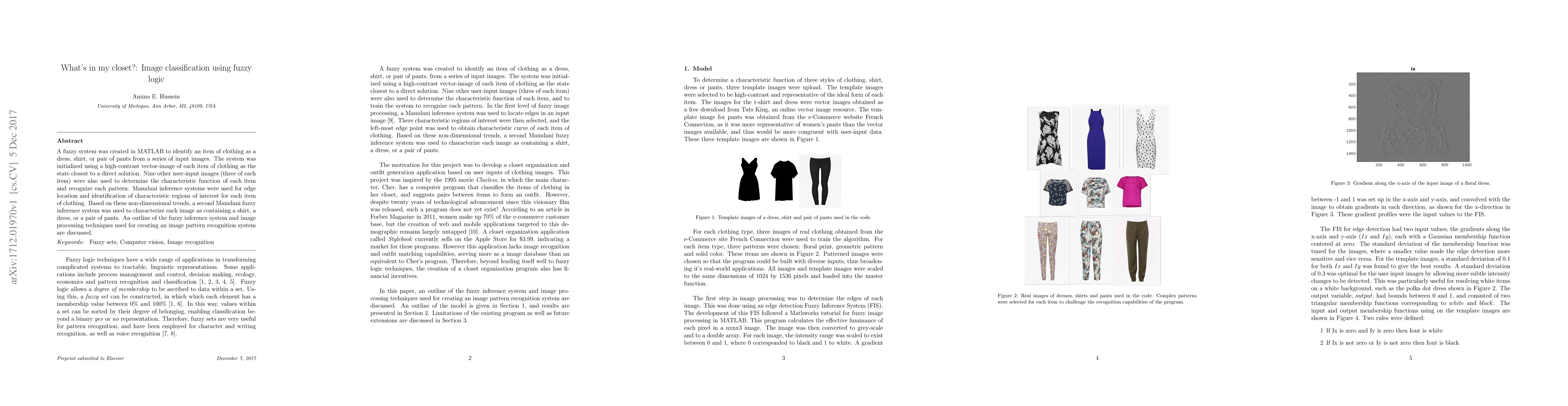 A fuzzy system was created in MATLAB to identify an item of clothing as a dress, shirt, or pair of pants from a series of input images. The system was initialized using a high-contrast vector-image of each item of clothing as the state closest to a direct solution. Nine other user-input images (three of each item) were also used to determine the characteristic function of each item and recognize each pattern. Mamdani inference systems were used for edge location and identification of characteristic regions of interest for each item of clothing. Based on these non-dimensional trends, a second Mamdani fuzzy inference system was used to characterize each image as containing a shirt, a dress, or a pair of pants. An outline of the fuzzy inference system and image processing techniques used for creating an image pattern recognition system are discussed.
