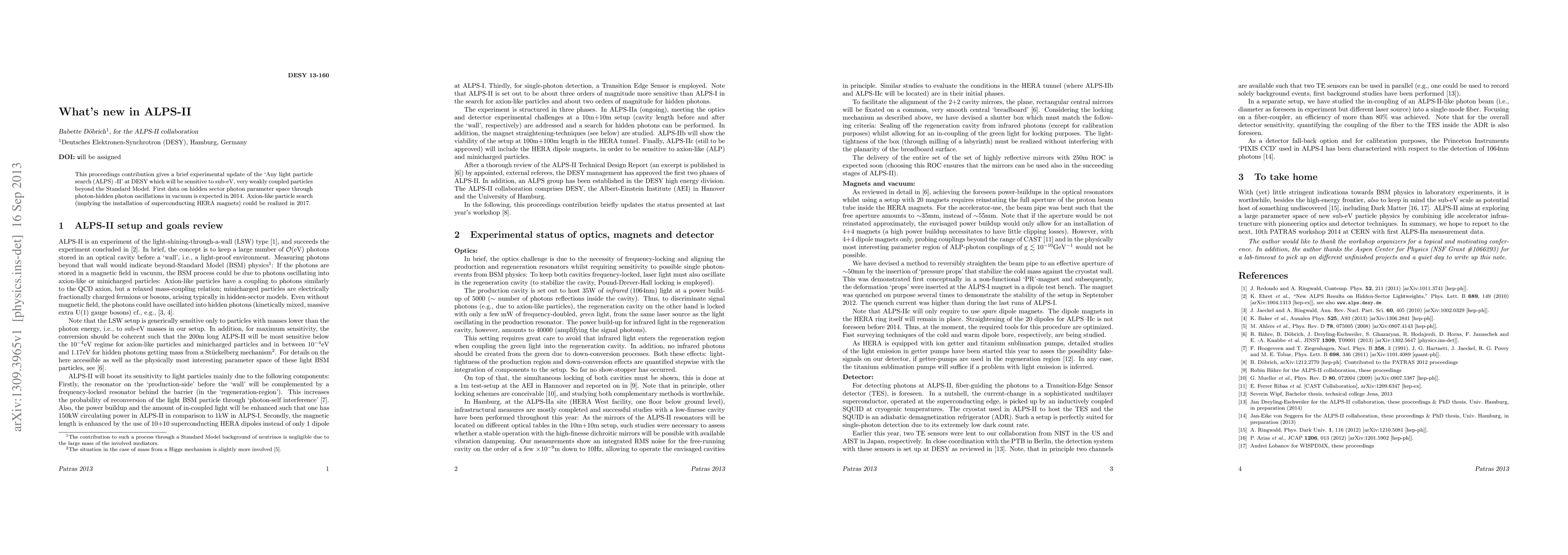This proceedings contribution gives a brief experimental update of the `Any light particle search (ALPS) -II' at DESY which will be sensitive to sub-eV, very weakly coupled particles beyond the Standard Model. First data on hidden sector photon parameter space through photon-hidden photon oscillations in vacuum is expected in 2014. Axion-like particle search (implying the installation of superconducting HERA magnets) could be realized in 2017.