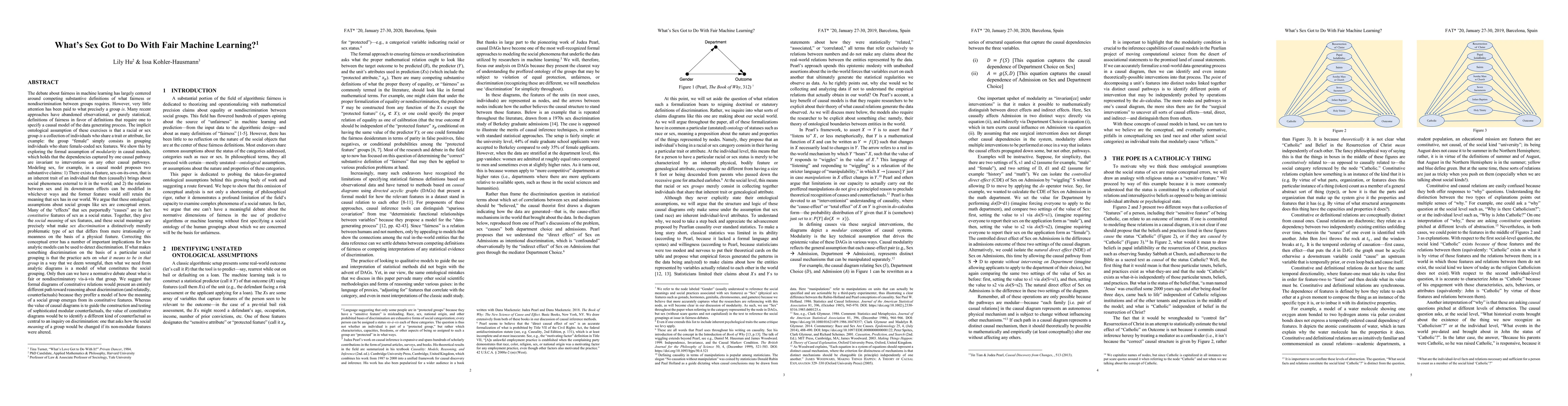 Debate about fairness in machine learning has largely centered around competing definitions of what fairness or nondiscrimination between groups requires. However, little attention has been paid to what precisely a group is. Many recent approaches to "fairness" require one to specify a causal model of the data generating process. These exercises make an implicit ontological assumption that a racial or sex group is simply a collection of individuals who share a given trait. We show this by exploring the formal assumption of modularity in causal models, which holds that the dependencies captured by one causal pathway are invariant to interventions on any other pathways. Causal models of sex propose two substantive claims: 1) There exists a feature, sex-on-its-own, that is an inherent trait of an individual that causally brings about social phenomena external to it in the world; and 2) the relations between sex and its effects can be modified in whichever ways and the former feature would still retain the meaning that sex has in our world. We argue that this ontological picture is false. Many of the "effects" that sex purportedly "causes" are in fact constitutive features of sex as a social status. They give the social meaning of sex features, meanings that are precisely what make sex discrimination a distinctively morally problematic type of action. Correcting this conceptual error has a number of implications for how models can be used to detect discrimination. Formal diagrams of constitutive relations present an entirely different path toward reasoning about discrimination. Whereas causal diagrams guide the construction of sophisticated modular counterfactuals, constitutive diagrams identify a different kind of counterfactual as central to an inquiry on discrimination: one that asks how the social meaning of a group would be changed if its non-modular features were altered.