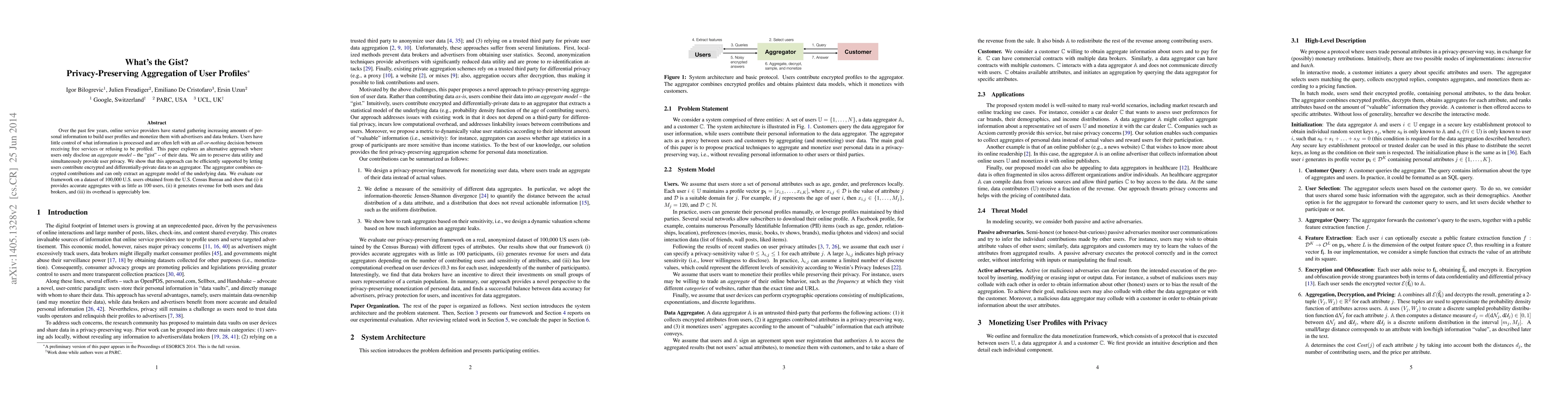 Over the past few years, online service providers have started gathering increasing amounts of personal information to build user profiles and monetize them with advertisers and data brokers. Users have little control of what information is processed and are often left with an all-or-nothing decision between receiving free services or refusing to be profiled. This paper explores an alternative approach where users only disclose an aggregate model -- the "gist" -- of their data. We aim to preserve data utility and simultaneously provide user privacy. We show that this approach can be efficiently supported by letting users contribute encrypted and differentially-private data to an aggregator. The aggregator combines encrypted contributions and can only extract an aggregate model of the underlying data. We evaluate our framework on a dataset of 100,000 U.S. users obtained from the U.S. Census Bureau and show that (i) it provides accurate aggregates with as little as 100 users, (ii) it generates revenue for both users and data brokers, and (iii) its overhead is appreciably low.