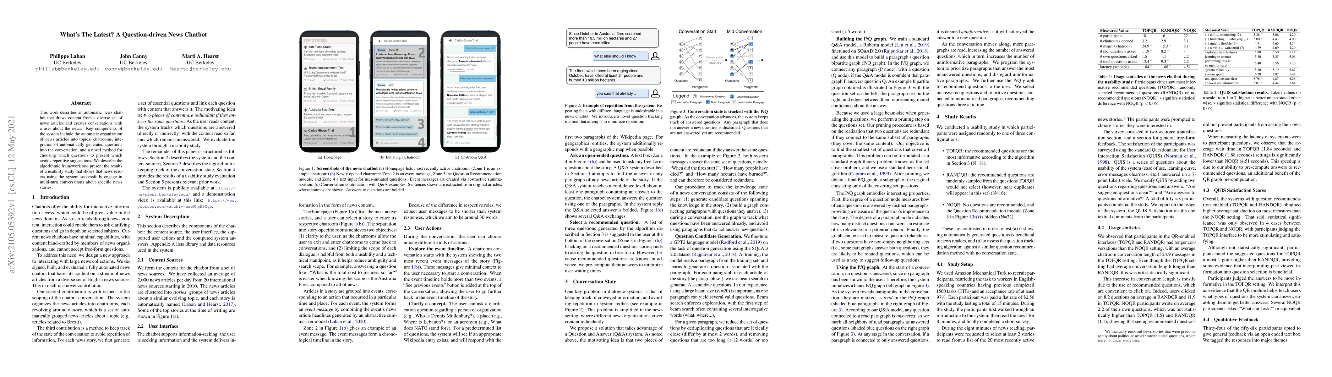 This research presents a question-driven news chatbot that organizes news articles into topical discussions and engages users in multi-turn conversations using automatically generated questions, with a usability study showing successful user engagement. The system's novel question selection method prevents repetitive suggestions.