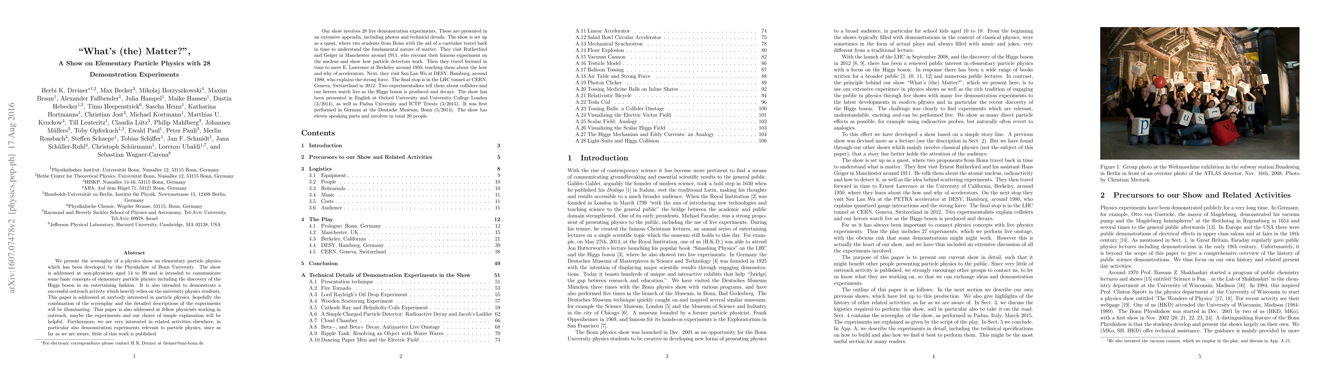 This paper details a physics show by Bonn University's Physikshow, aimed at non-physicists aged 14+, that uses 28 demonstration experiments to entertain and educate about elementary particle physics, including the discovery of the Higgs boson. The show, performed by university students, follows a time-traveling quest to various historical and contemporary physics milestones.