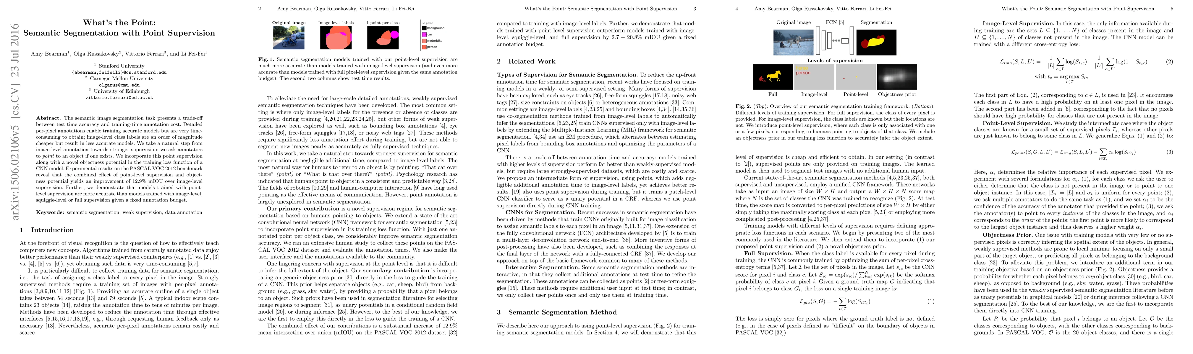The semantic image segmentation task presents a trade-off between test time accuracy and training-time annotation cost. Detailed per-pixel annotations enable training accurate models but are very time-consuming to obtain, image-level class labels are an order of magnitude cheaper but result in less accurate models. We take a natural step from image-level annotation towards stronger supervision: we ask annotators to point to an object if one exists. We incorporate this point supervision along with a novel objectness potential in the training loss function of a CNN model. Experimental results on the PASCAL VOC 2012 benchmark reveal that the combined effect of point-level supervision and objectness potential yields an improvement of 12.9% mIOU over image-level supervision. Further, we demonstrate that models trained with point-level supervision are more accurate than models trained with image-level, squiggle-level or full supervision given a fixed annotation budget.
