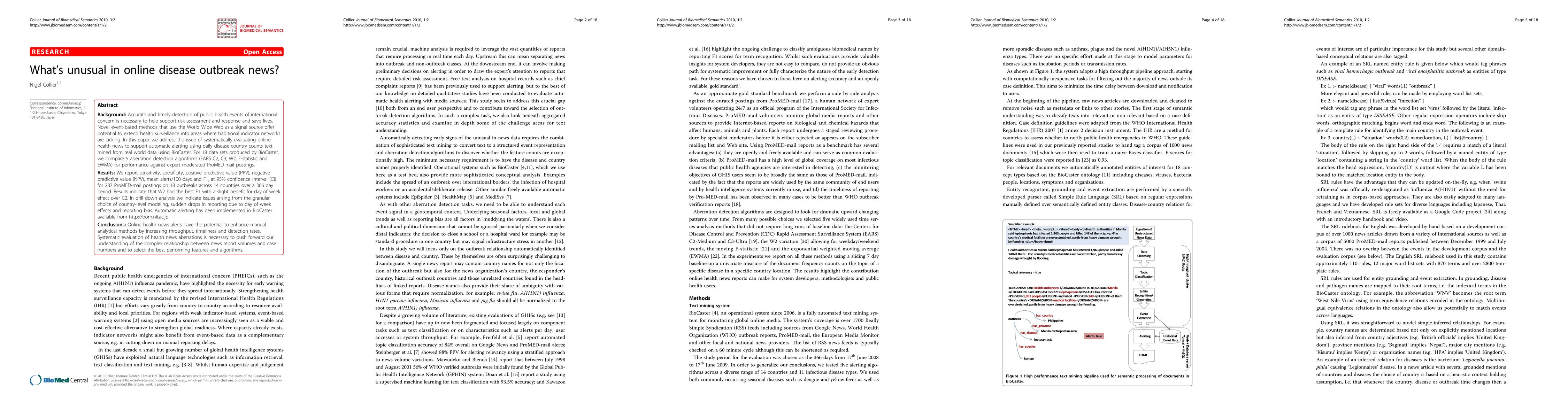 This study evaluates online disease outbreak news using 18 data sets to compare five aberration detection algorithms for their performance against expert-moderated postings, finding that the W2 algorithm had the best F1 score with a slight benefit from day-of-week effects.