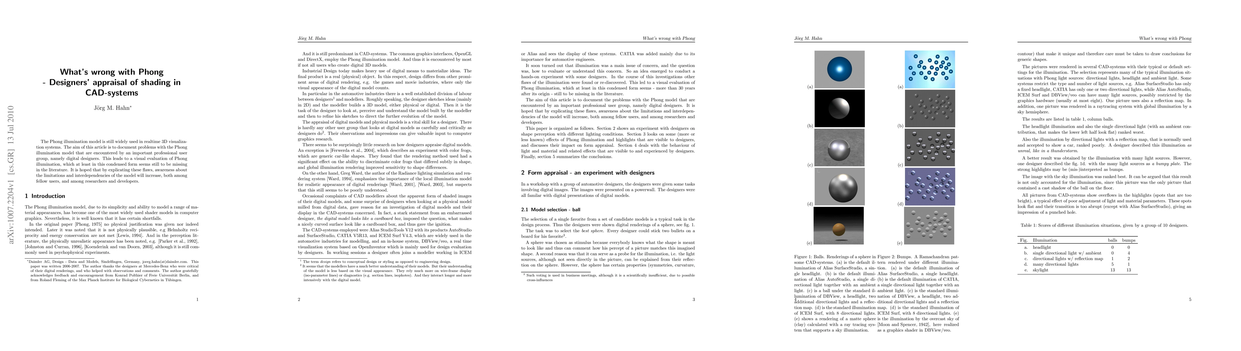 The Phong illumination model is still widely used in realtime 3D visualization systems. The aim of this article is to document problems with the Phong illumination model that are encountered by an important professional user group, namely digital designers. This leads to a visual evaluation of Phong illumination, which at least in this condensed form seems still to be missing in the literature. It is hoped that by explicating these flaws, awareness about the limitations and interdependencies of the model will increase, both among fellow users, and among researchers and developers.