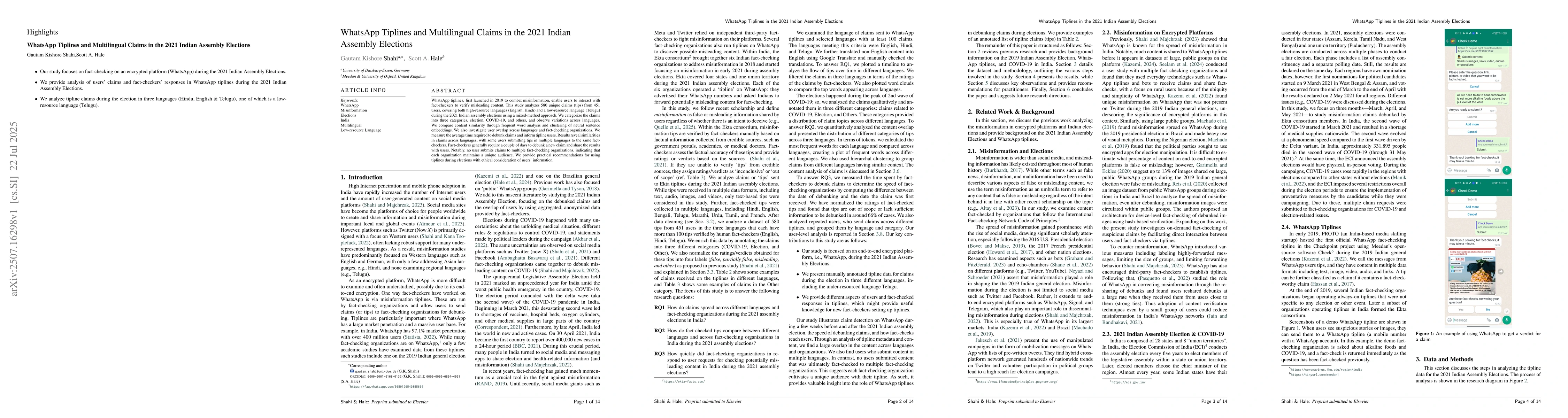 This study analyzed multilingual WhatsApp tiplines data during the 2021 Indian assembly elections, focusing on user perspectives and content in Hindi, English, and Telugu. The analysis is based on 580 filtered claims across three languages.