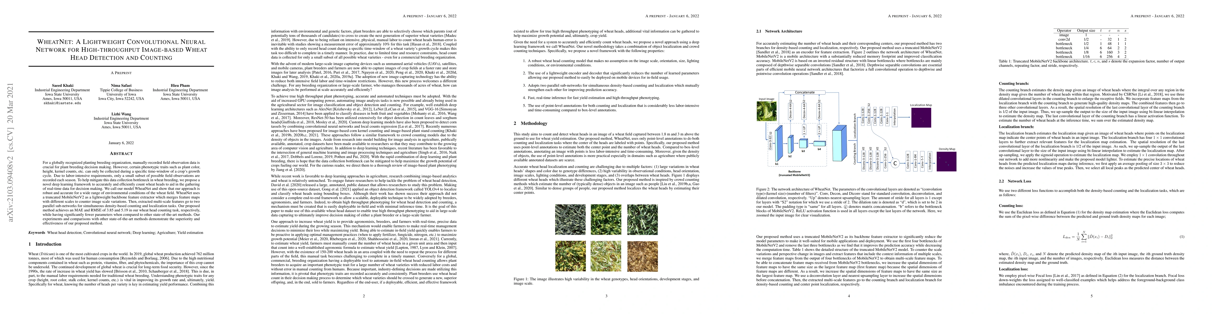 WheatNet is a lightweight convolutional neural network designed for high-throughput image-based wheat head detection and counting, utilizing a truncated MobileNetV2 to efficiently extract multi-scale features for simultaneous density-based counting and localization. The model achieves robust performance with an MAE and RMSE of 3.85 and 5.19, respectively, while being significantly more parameter-efficient compared to other state-of-the-art methods.