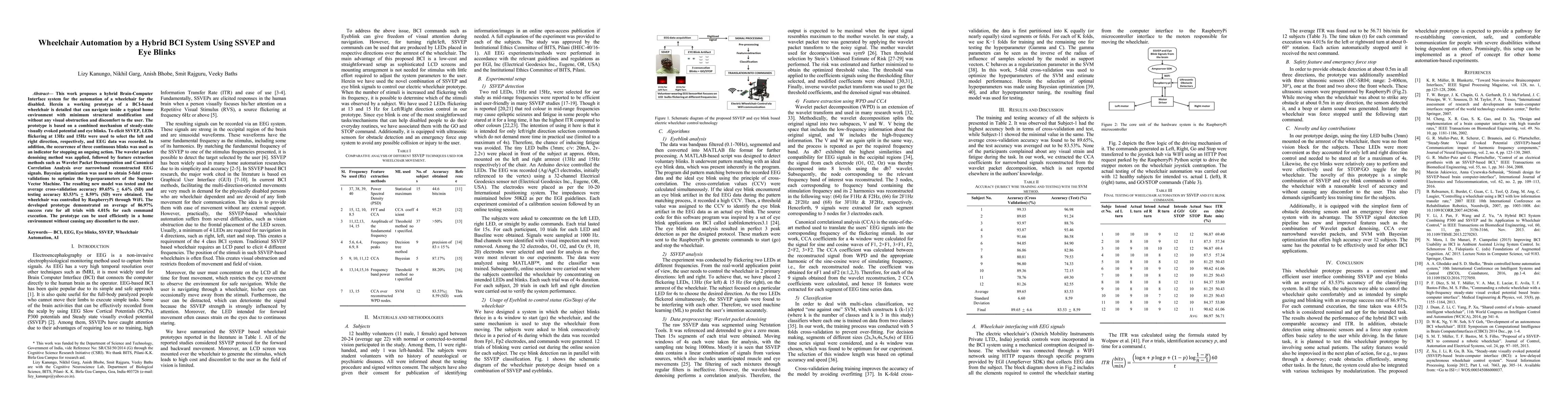 This work proposes a hybrid Brain Computer Interface system for the automation of a wheelchair for the disabled. Herein a working prototype of a BCI-based wheelchair is detailed that can navigate inside a typical home environment with minimum structural modification and without any visual obstruction and discomfort to the user. The prototype is based on a combined mechanism of steady-state visually evoked potential and eye blinks. To elicit SSVEP, LEDs flickering at 13Hz and 15Hz were used to select the left and right direction, respectively, and EEG data was recorded. In addition, the occurrence of three continuous blinks was used as an indicator for stopping an ongoing action. The wavelet packet denoising method was applied, followed by feature extraction methods such as Wavelet Packet Decomposition and Canonical Correlation Analysis over narrowband reconstructed EEG signals. Bayesian optimization was used to obtain 5 fold cross-validations to optimize the hyperparameters of the Support Vector Machine. The resulting new model was tested and the average cross-validation accuracy 89.65% + 6.6% (SD) and testing accuracy 83.53% + 8.59% (SD) were obtained. The wheelchair was controlled by RaspberryPi through WiFi. The developed prototype demonstrated an average of 86.97% success rate for all trials with 4.015s for each command execution. The prototype can be used efficiently in a home environment without causing any discomfort to the user.