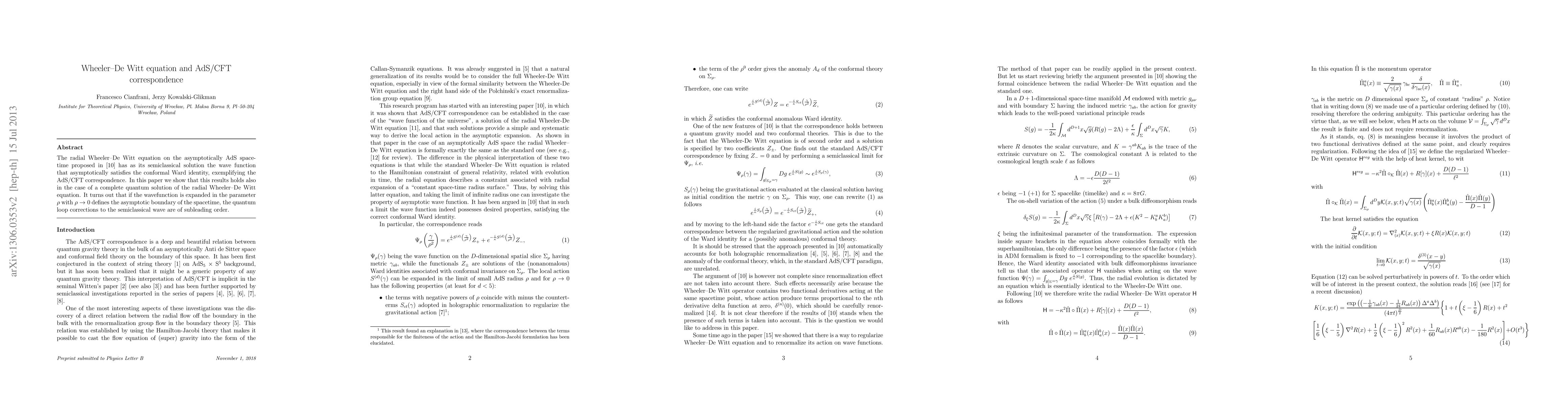 The radial Wheeler--De Witt equation on the asymptotically AdS spacetime proposed in [9] has as its semiclassical solution the wave function that asymptotically satisfies the conformal Ward identity, exemplifying the AdS/CFT correspondence. In this paper we show that this results holds also in the case of a complete quantum solution of the radial Wheeler--De Witt equation. It turns out that if the wavefunction is expanded in the parameter $\rho$ with $\rho\rightarrow0$ defines the asymptotic boundary of the spacetime, the quantum loop corrections to the semiclassical wave are of subleading order.