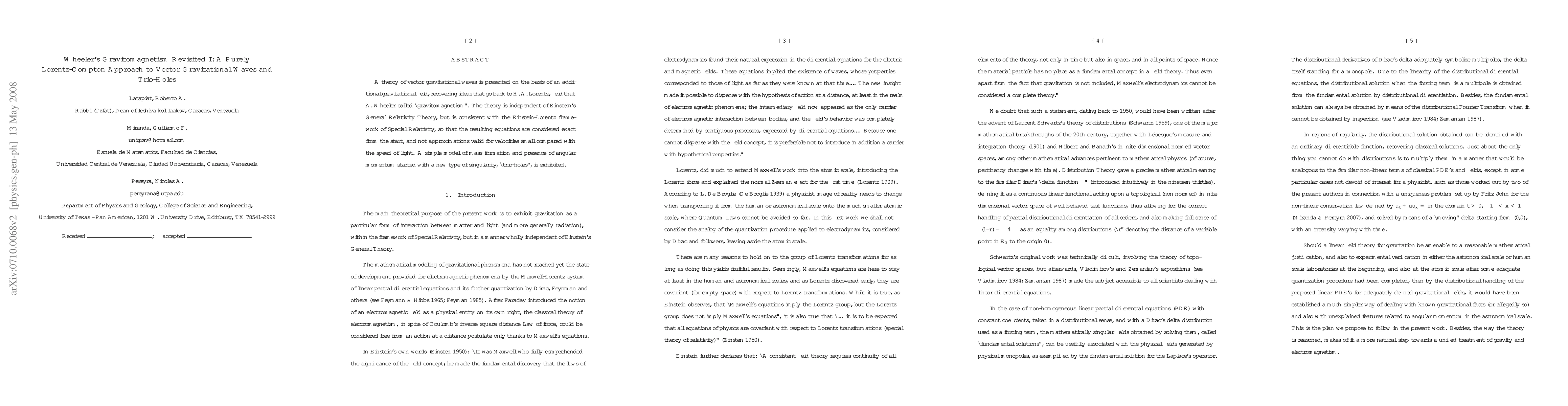 A theory of vector gravitational waves is presented on the basis of an additional gravitational field, recovering ideas that go back to H. A. Lorentz, field that A. Wheeler called ``gravitomagnetism''. The theory is independent of Einstein's General Relativity Theory, but is consistent with the Einstein-Lorentz framework of Special Relativity, so that the resulting equations are considered exact from the start, and not approximations valid for velocities small compared with the speed of light. A simple model of mass formation and presence of angular momentum started with a new type of singularity, ``trio-holes'', is exhibited.