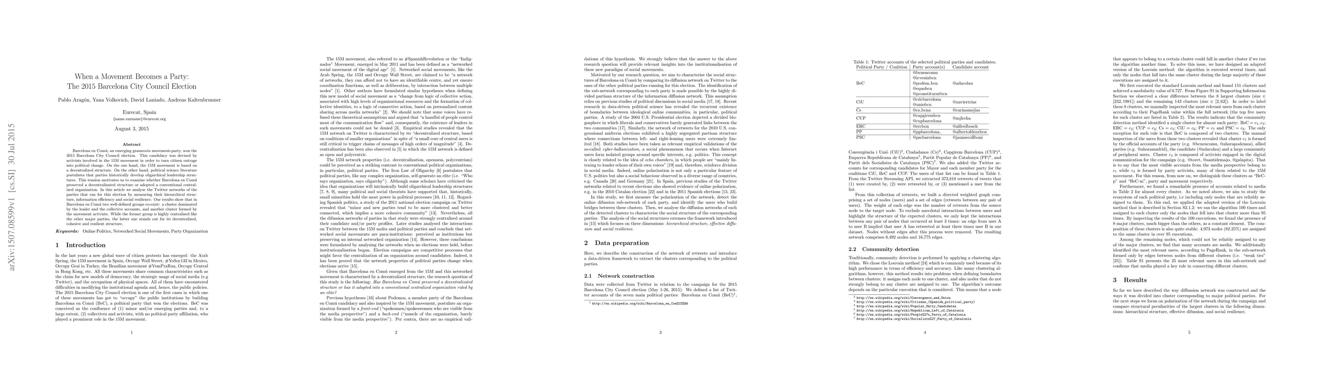 Barcelona en Com\'u, an emerging grassroots movement-party, won the 2015 Barcelona City Council election. This candidacy was devised by activists involved in the 15M movement in order to turn citizen outrage into political change. On the one hand, the 15M movement is based on a decentralized structure. On the other hand, political science literature postulates that parties historically develop oligarchical leadership structures. This tension motivates us to examine whether Barcelona en Com\'u preserved a decentralizated structure or adopted a conventional centralized organization. In this article we analyse the Twitter networks of the parties that ran for this election by measuring their hierarchical structure, information efficiency and social resilience. Our results show that in Barcelona en Com\'u two well-defined groups co-exist: a cluster dominated by the leader and the collective accounts, and another cluster formed by the movement activists. While the former group is highly centralized like the other major parties, the latter one stands out for its decentralized, cohesive and resilient structure.
