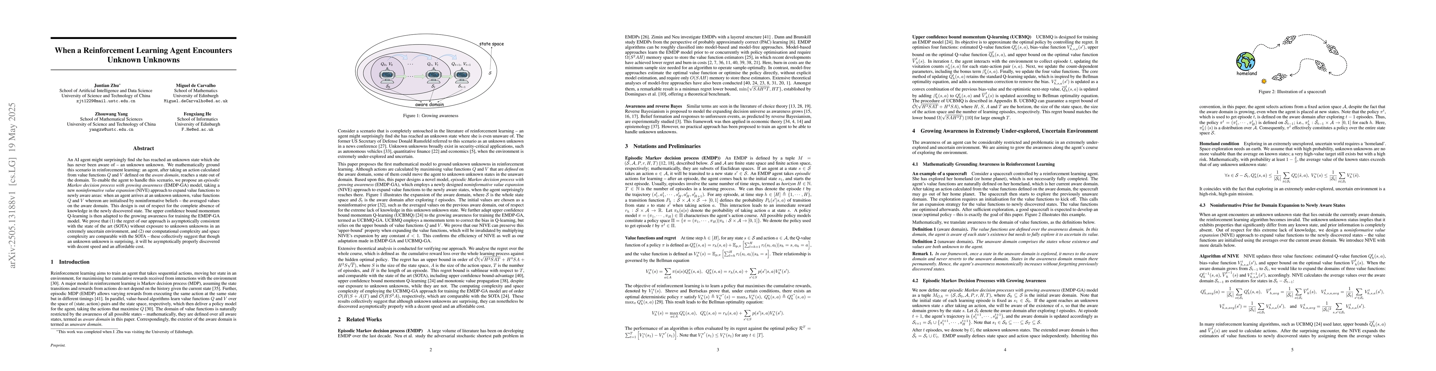 The paper proposes the EMDP-GA model, utilizing a noninformative value expansion (NIVE) approach to extend value functions Q and V into uncharted territories. Upper confidence bound momentum Q-learning is adapted for training this model, enabling an RL agent to handle 'unknown unknowns' - states outside its aware domain.