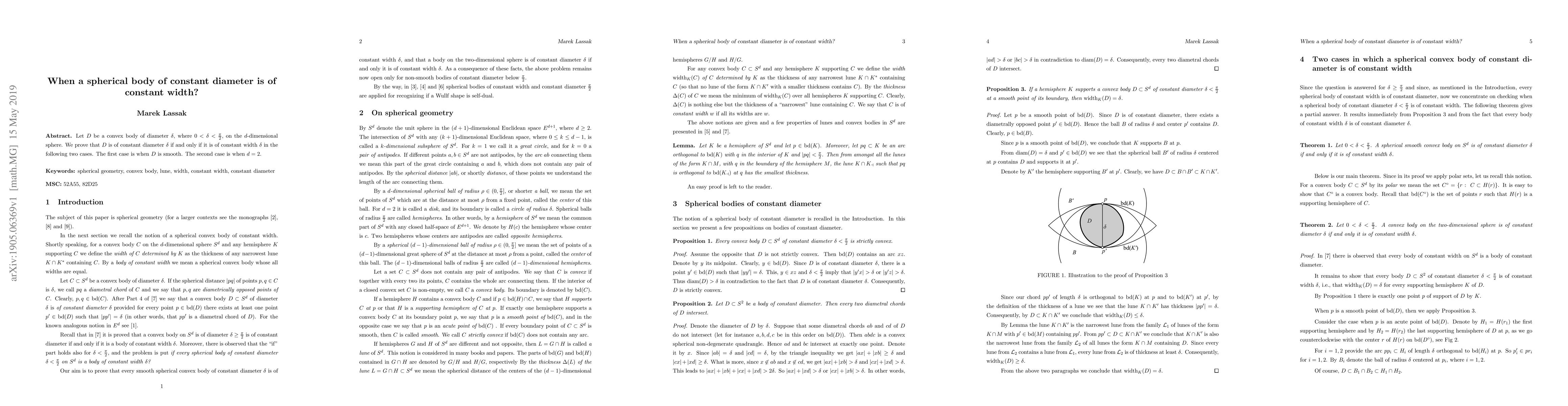 Researchers prove that a convex body on a d-dimensional sphere has constant diameter if and only if it has constant width in two specific cases: when the body is smooth and in 2D space.