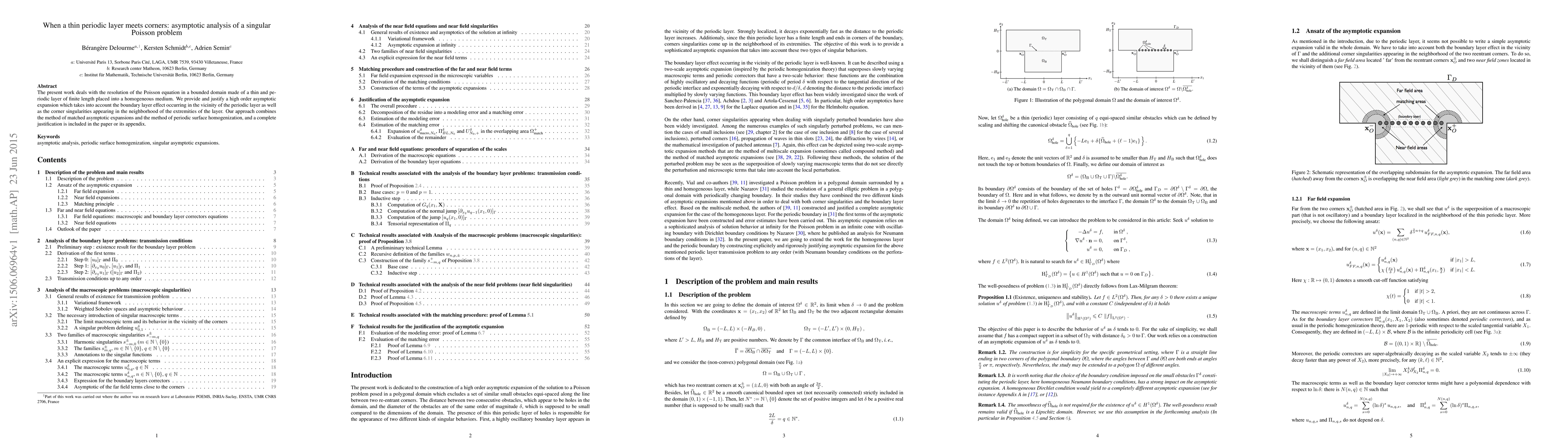 The present work deals with the resolution of the Poisson equation in a bounded domain made of a thin and periodic layer of finite length placed into a homogeneous medium. We provide and justify a high order asymptotic expansion which takes into account the boundary layer effect occurring in the vicinity of the periodic layer as well as the corner singularities appearing in the neighborhood of the extremities of the layer. Our approach combines the method of matched asymptotic expansions and the method of periodic surface homogenization, and a complete justification is included in the paper or its appendix.