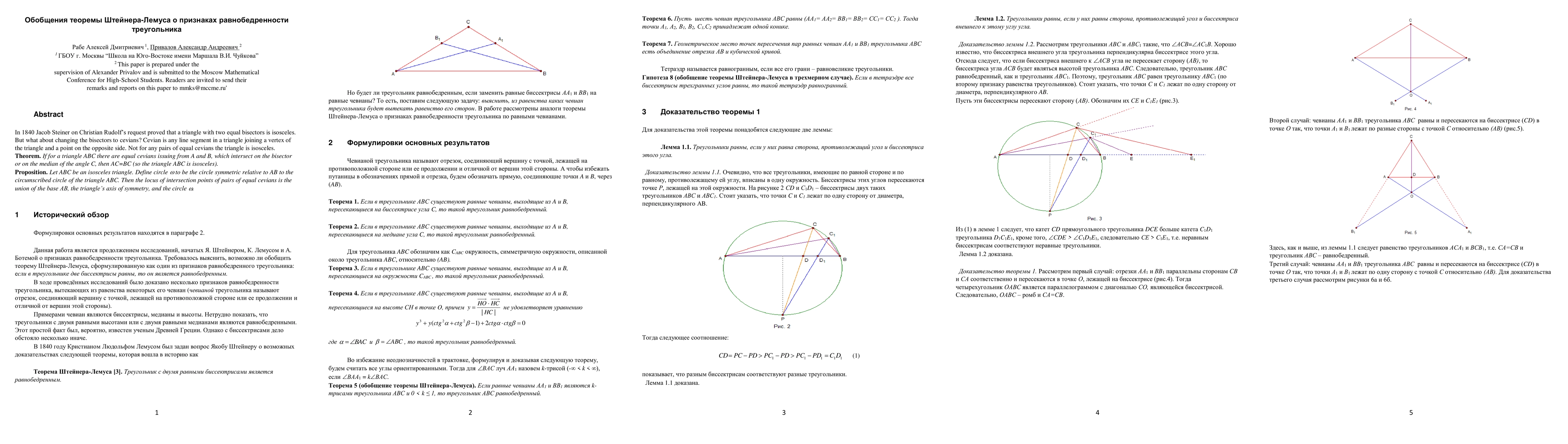 In 1840 Jacob Steiner on Christian Rudolf's request proved that a triangle with two equal bisectors is isosceles. But what about changing the bisectors to cevians? Cevian is any line segment in a triangle with one endpoint on a vertex of the triangle and other endpoint on the opposite side. Not for any pairs of equal cevians the triangle is isosceles. Theorem. If for a triangle ABC there are equal cevians issuing from A and B, which intersect on the bisector or on the median of the angle C, then AC=BC (so the triangle ABC is isosceles). Proposition. Let ABC be an isosceles triangle. Define circle C to be the circle symmetric relative to AB to the circumscribed circle of the triangle ABC. Then the locus of intersection points of pairs of equal cevians is the union of the base AB, the triangle's axis of symmetry, and the circle C.
