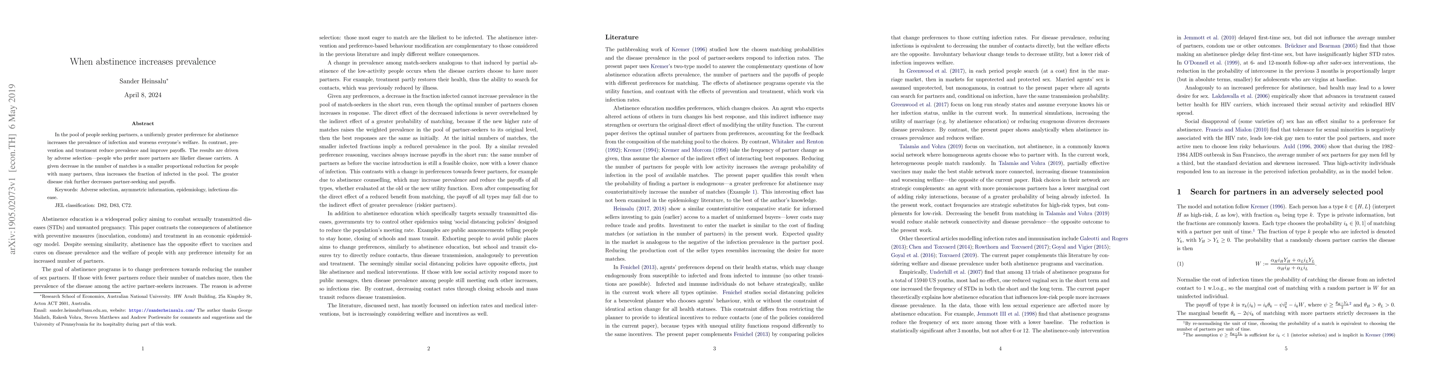 In the pool of people seeking partners, a uniformly greater preference for abstinence increases the prevalence of infection and worsens everyone's welfare. In contrast, prevention and treatment reduce prevalence and improve payoffs. The results are driven by adverse selection: people who prefer more partners are likelier disease carriers. A given decrease in the number of matches is a smaller proportional reduction for people with many partners, thus increases the fraction of infected in the pool. The greater disease risk further decreases partner-seeking and payoffs.