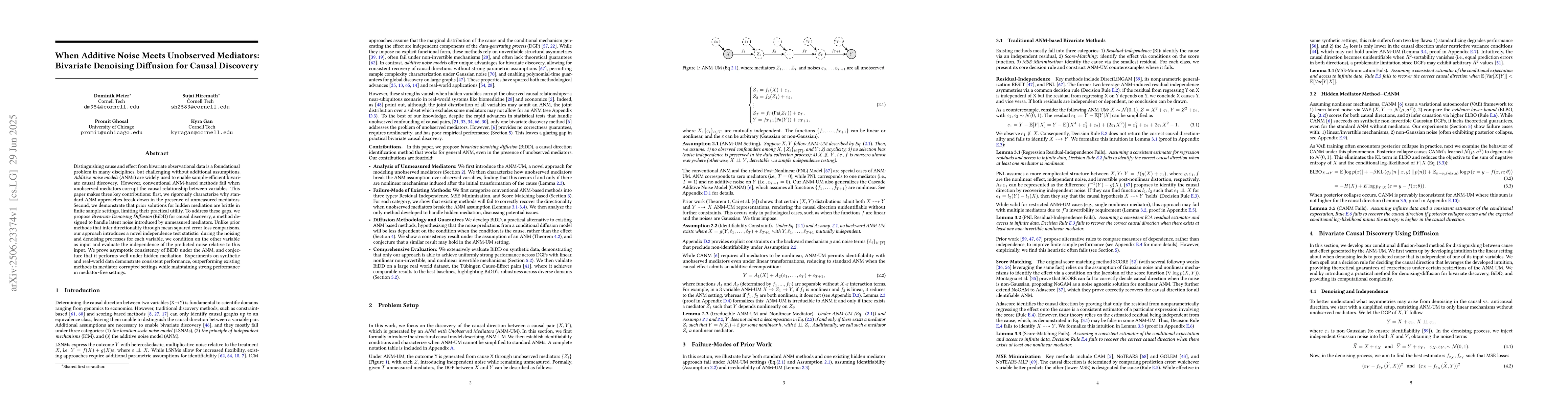 Distinguishing cause and effect from bivariate observational data is a foundational problem in many disciplines, but challenging without additional assumptions. Additive noise models (ANMs) are widely used to enable sample-efficient bivariate causal discovery. However, conventional ANM-based methods fail when unobserved mediators corrupt the causal relationship between variables. This paper makes three key contributions: first, we rigorously characterize why standard ANM approaches break down in the presence of unmeasured mediators. Second, we demonstrate that prior solutions for hidden mediation are brittle in finite sample settings, limiting their practical utility. To address these gaps, we propose Bivariate Denoising Diffusion (BiDD) for causal discovery, a method designed to handle latent noise introduced by unmeasured mediators. Unlike prior methods that infer directionality through mean squared error loss comparisons, our approach introduces a novel independence test statistic: during the noising and denoising processes for each variable, we condition on the other variable as input and evaluate the independence of the predicted noise relative to this input. We prove asymptotic consistency of BiDD under the ANM, and conjecture that it performs well under hidden mediation. Experiments on synthetic and real-world data demonstrate consistent performance, outperforming existing methods in mediator-corrupted settings while maintaining strong performance in mediator-free settings.