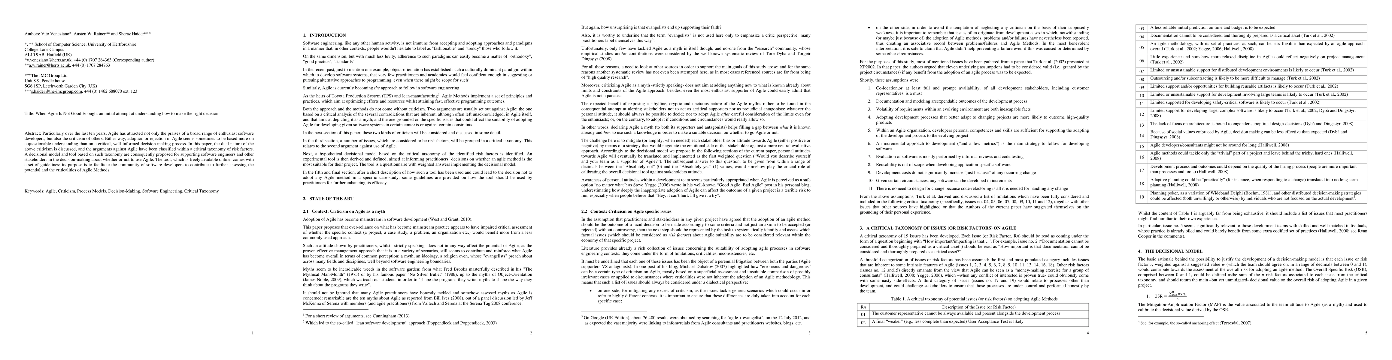 This paper discusses the dual nature of criticism against Agile methodologies and proposes a decisional model and tool to help software engineers and stakeholders make informed decisions about adopting Agile, based on a taxonomy of risk factors. The tool aims to facilitate community-driven assessment of Agile's potential and limitations.