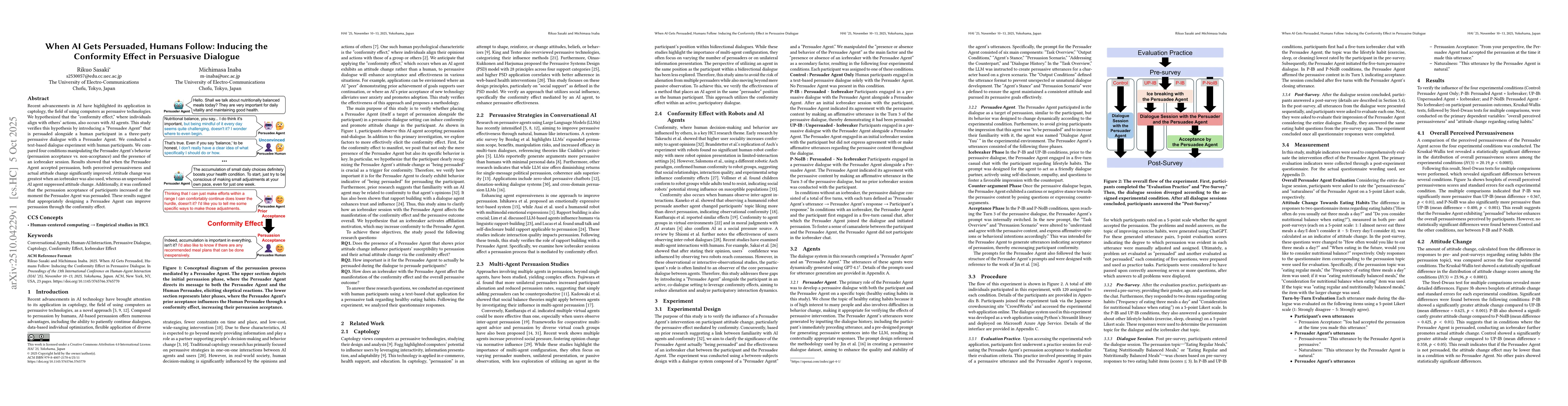 Recent advancements in AI have highlighted its application in captology, the field of using computers as persuasive technologies. We hypothesized that the "conformity effect," where individuals align with others' actions, also occurs with AI agents. This study verifies this hypothesis by introducing a "Persuadee Agent" that is persuaded alongside a human participant in a three-party persuasive dialogue with a Persuader Agent. We conducted a text-based dialogue experiment with human participants. We compared four conditions manipulating the Persuadee Agent's behavior (persuasion acceptance vs. non-acceptance) and the presence of an icebreaker session. Results showed that when the Persuadee Agent accepted persuasion, both perceived persuasiveness and actual attitude change significantly improved. Attitude change was greatest when an icebreaker was also used, whereas an unpersuaded AI agent suppressed attitude change. Additionally, it was confirmed that the persuasion acceptance of participants increased at the moment the Persuadee Agent was persuaded. These results suggest that appropriately designing a Persuadee Agent can improve persuasion through the conformity effect.