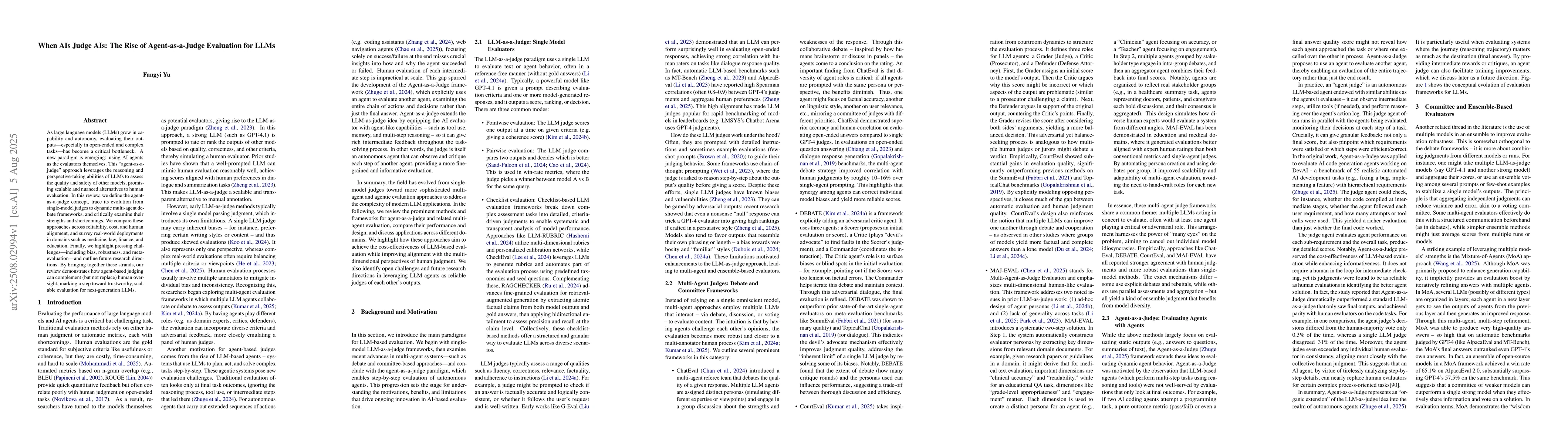 As large language models (LLMs) grow in capability and autonomy, evaluating their outputs-especially in open-ended and complex tasks-has become a critical bottleneck. A new paradigm is emerging: using AI agents as the evaluators themselves. This "agent-as-a-judge" approach leverages the reasoning and perspective-taking abilities of LLMs to assess the quality and safety of other models, promising calable and nuanced alternatives to human evaluation. In this review, we define the agent-as-a-judge concept, trace its evolution from single-model judges to dynamic multi-agent debate frameworks, and critically examine their strengths and shortcomings. We compare these approaches across reliability, cost, and human alignment, and survey real-world deployments in domains such as medicine, law, finance, and education. Finally, we highlight pressing challenges-including bias, robustness, and meta evaluation-and outline future research directions. By bringing together these strands, our review demonstrates how agent-based judging can complement (but not replace) human oversight, marking a step toward trustworthy, scalable evaluation for next-generation LLMs.