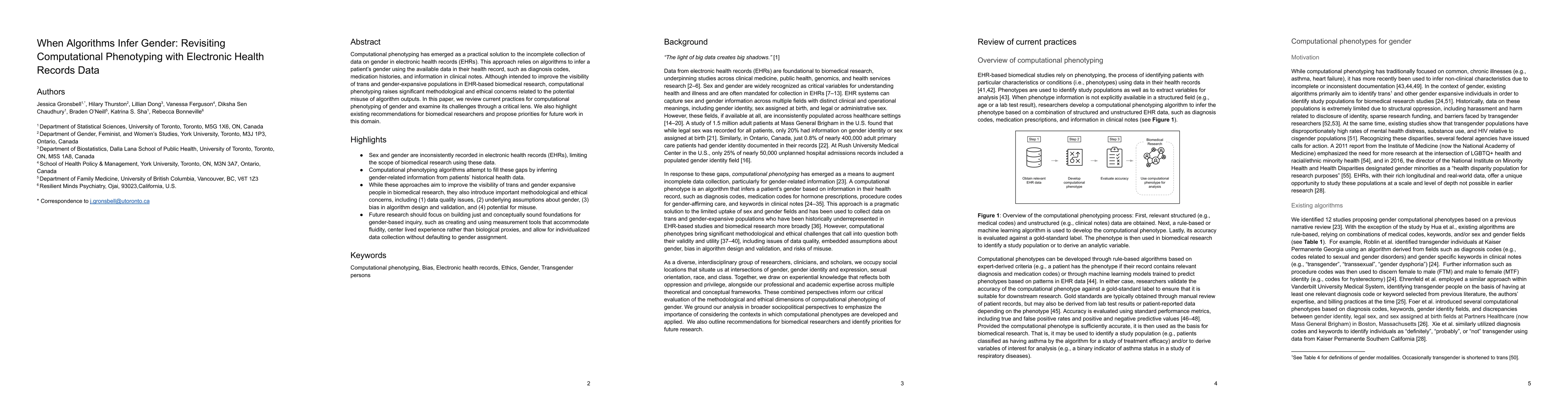 Computational phenotyping has emerged as a practical solution to the incomplete collection of data on gender in electronic health records (EHRs). This approach relies on algorithms to infer a patient's gender using the available data in their health record, such as diagnosis codes, medication histories, and information in clinical notes. Although intended to improve the visibility of trans and gender-expansive populations in EHR-based biomedical research, computational phenotyping raises significant methodological and ethical concerns related to the potential misuse of algorithm outputs. In this paper, we review current practices for computational phenotyping of gender and examine its challenges through a critical lens. We also highlight existing recommendations for biomedical researchers and propose priorities for future work in this domain.