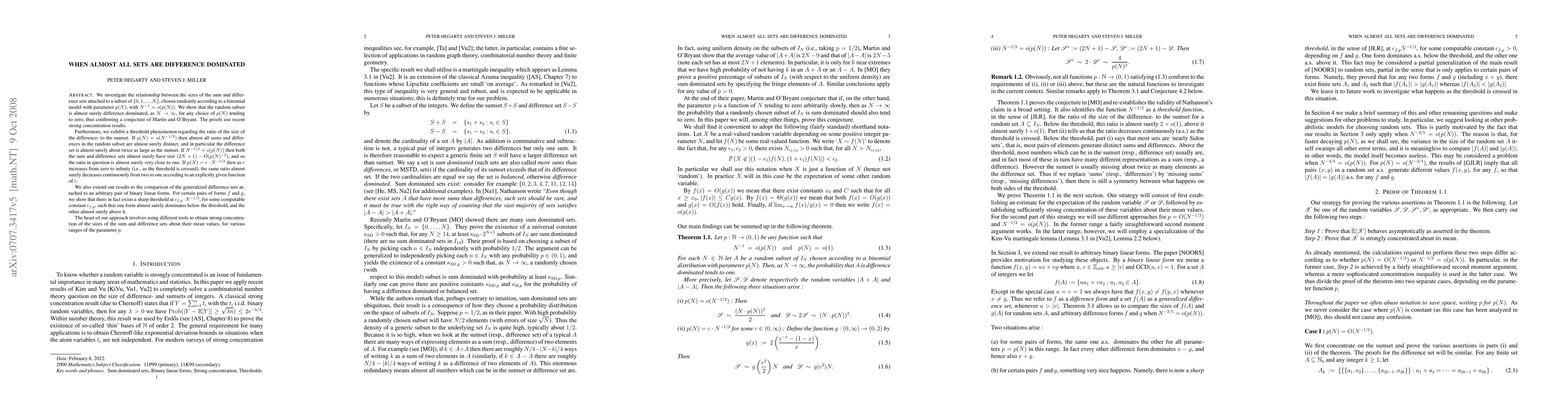 This paper explores the sizes of sum and difference sets derived from a randomly chosen subset of {0,1,...,N} under a binomial model, demonstrating almost sure difference domination as N grows large. It reveals a threshold phenomenon affecting the ratio of these sets' sizes, showing that the difference set is twice as large as the sumset under certain conditions.