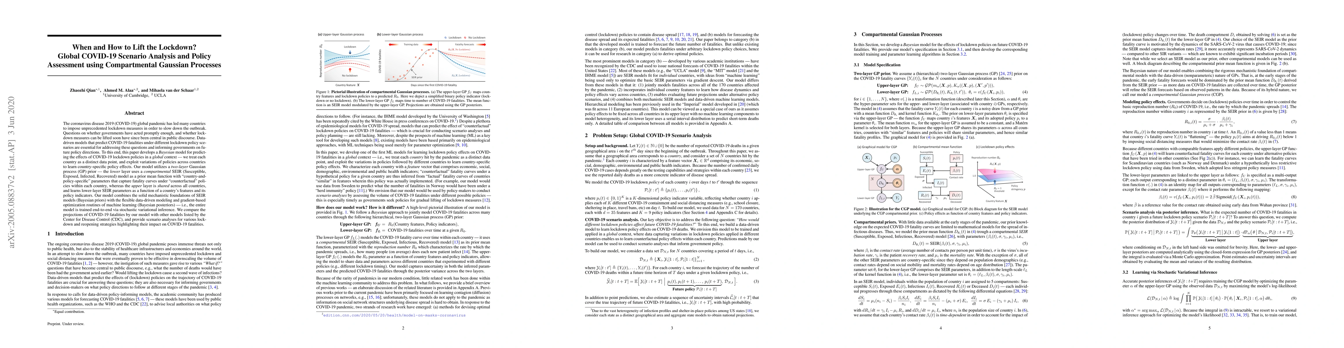 This paper develops a Bayesian model using compartmental Gaussian processes to predict the effects of COVID-19 lockdown policies globally. It combines SEIR models with machine learning to inform governments on optimal lockdown lifting strategies, comparing its projections with other models and analyzing various lockdown and reopening scenarios.