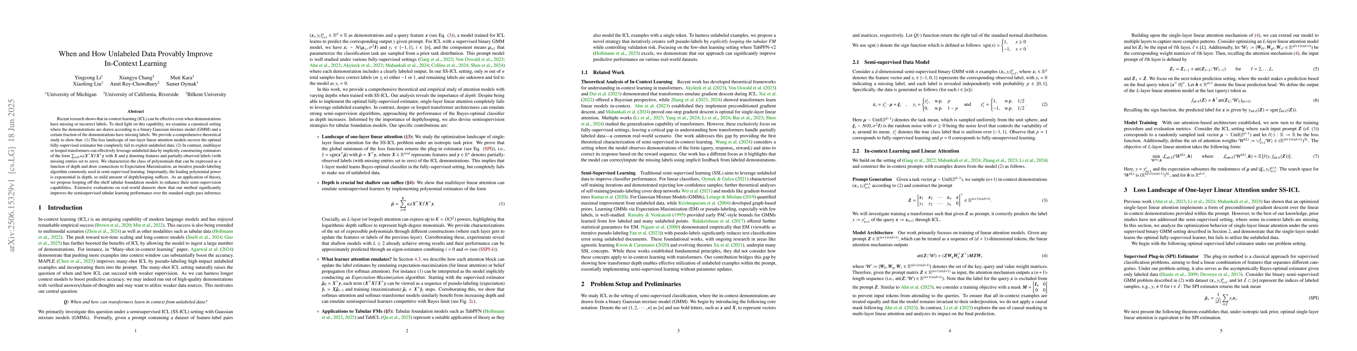 Recent research shows that in-context learning (ICL) can be effective even when demonstrations have missing or incorrect labels. To shed light on this capability, we examine a canonical setting where the demonstrations are drawn according to a binary Gaussian mixture model (GMM) and a certain fraction of the demonstrations have missing labels. We provide a comprehensive theoretical study to show that: (1) The loss landscape of one-layer linear attention models recover the optimal fully-supervised estimator but completely fail to exploit unlabeled data; (2) In contrast, multilayer or looped transformers can effectively leverage unlabeled data by implicitly constructing estimators of the form $\sum_{i\ge 0} a_i (X^\top X)^iX^\top y$ with $X$ and $y$ denoting features and partially-observed labels (with missing entries set to zero). We characterize the class of polynomials that can be expressed as a function of depth and draw connections to Expectation Maximization, an iterative pseudo-labeling algorithm commonly used in semi-supervised learning. Importantly, the leading polynomial power is exponential in depth, so mild amount of depth/looping suffices. As an application of theory, we propose looping off-the-shelf tabular foundation models to enhance their semi-supervision capabilities. Extensive evaluations on real-world datasets show that our method significantly improves the semisupervised tabular learning performance over the standard single pass inference.