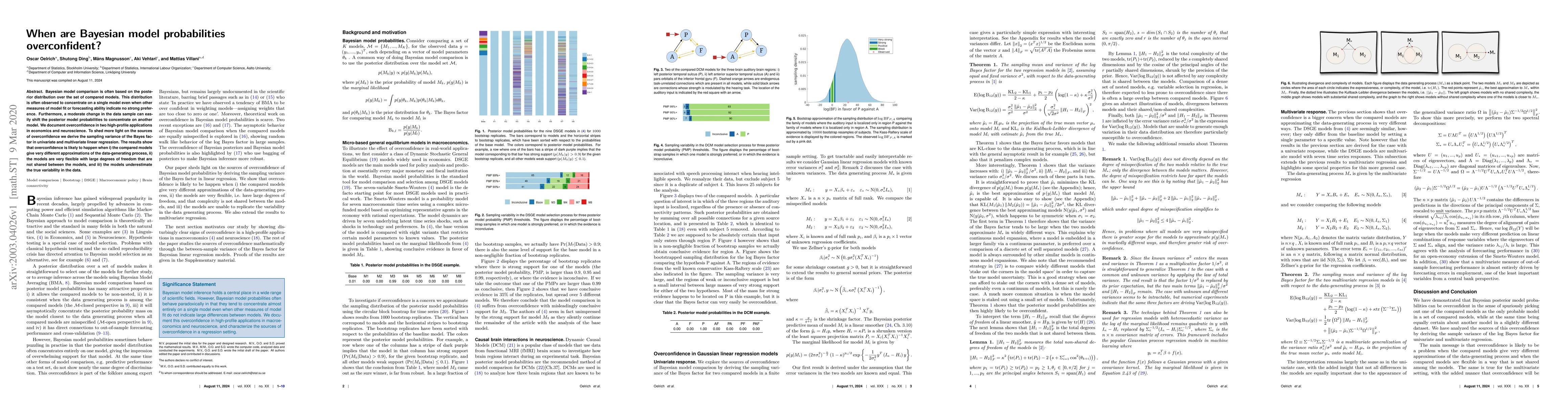 Bayesian model comparison is often based on the posterior distribution over the set of compared models. This distribution is often observed to concentrate on a single model even when other measures of model fit or forecasting ability indicate no strong preference. Furthermore, a moderate change in the data sample can easily shift the posterior model probabilities to concentrate on another model. We document overconfidence in two high-profile applications in economics and neuroscience. To shed more light on the sources of overconfidence we derive the sampling variance of the Bayes factor in univariate and multivariate linear regression. The results show that overconfidence is likely to happen when i) the compared models give very different approximations of the data-generating process, ii) the models are very flexible with large degrees of freedom that are not shared between the models, and iii) the models underestimate the true variability in the data.