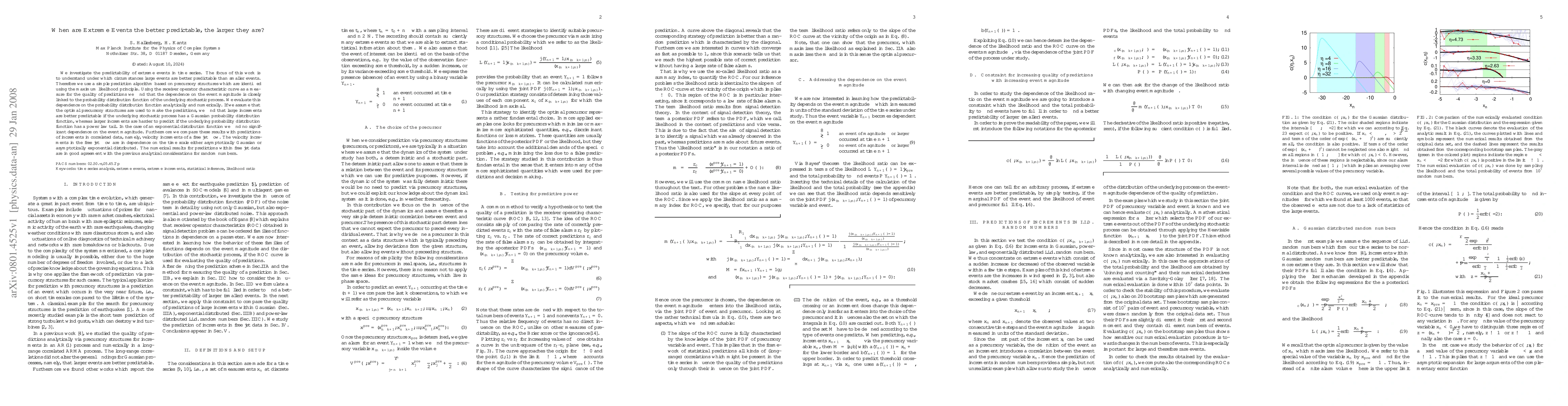 This paper explores the predictability of extreme events in time series, finding that large events are better predicted when the underlying stochastic process follows a Gaussian distribution. Conversely, large events are harder to predict if the process has a power law tail, while no significant magnitude dependence is found for exponential distributions.