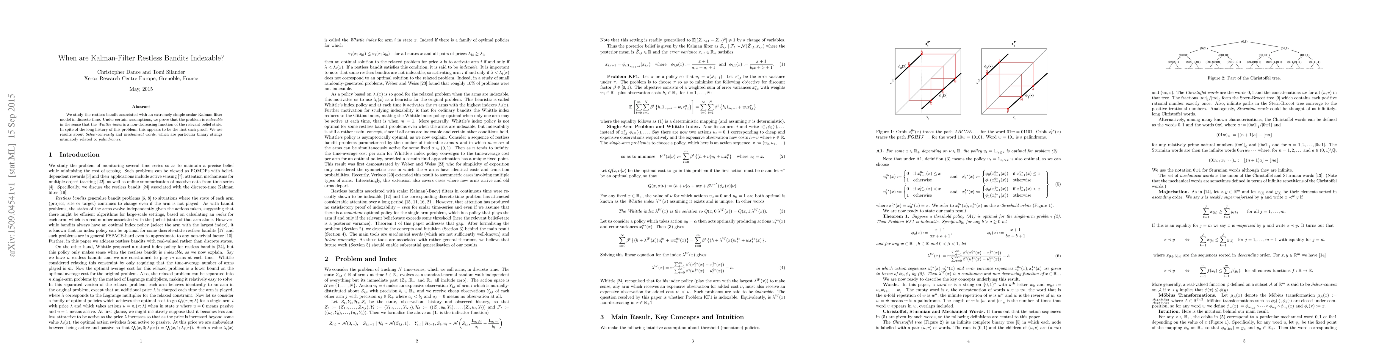 We study the restless bandit associated with an extremely simple scalar Kalman filter model in discrete time. Under certain assumptions, we prove that the problem is indexable in the sense that the Whittle index is a non-decreasing function of the relevant belief state. In spite of the long history of this problem, this appears to be the first such proof. We use results about Schur-convexity and mechanical words, which are particular binary strings intimately related to palindromes.