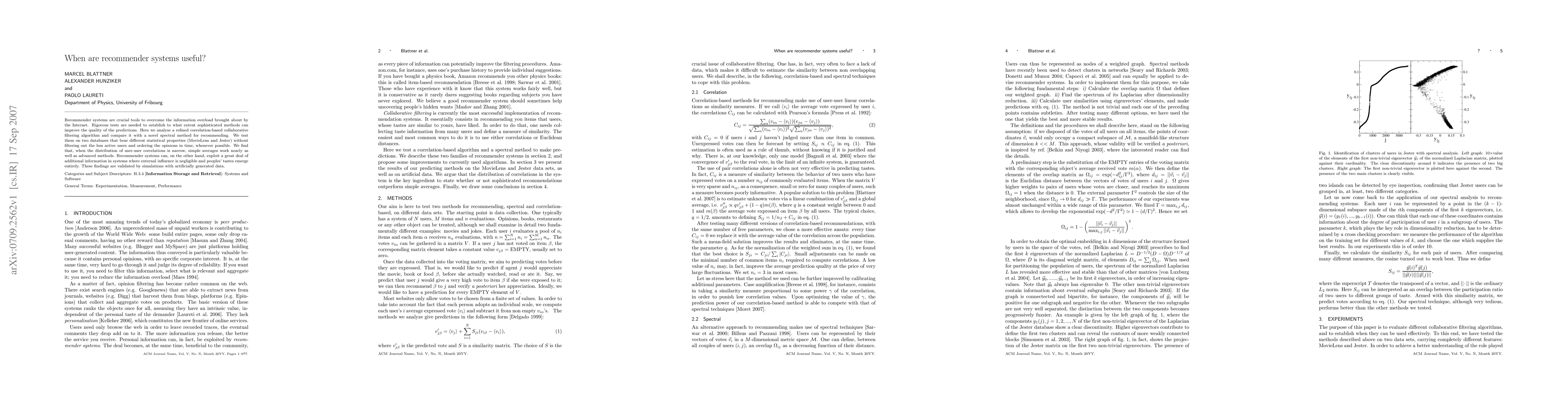This paper evaluates the effectiveness of recommender systems using correlation-based collaborative filtering and spectral methods, finding that simple averages perform nearly as well as advanced methods when user-user correlations are narrow. Recommender systems are most effective when external influences are minimal and users' tastes are distinct.