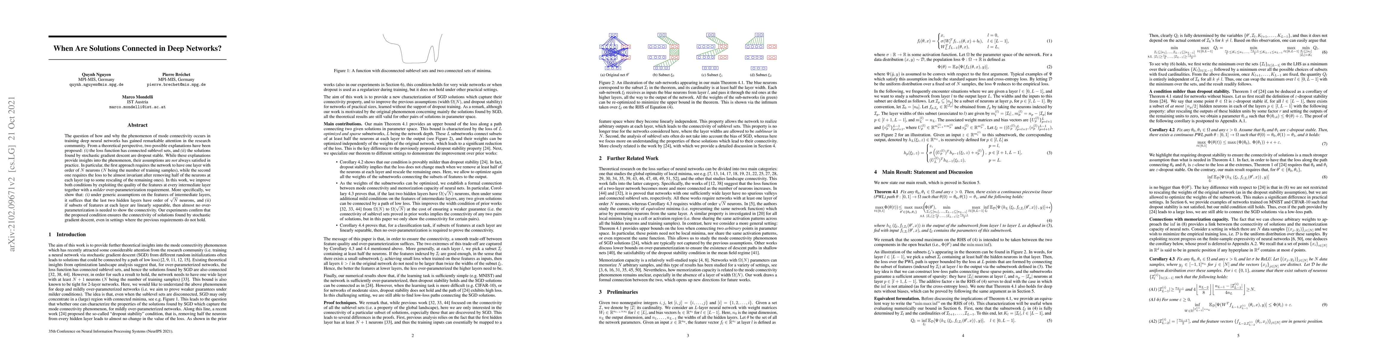 The question of how and why the phenomenon of mode connectivity occurs in training deep neural networks has gained remarkable attention in the research community. From a theoretical perspective, two possible explanations have been proposed: (i) the loss function has connected sublevel sets, and (ii) the solutions found by stochastic gradient descent are dropout stable. While these explanations provide insights into the phenomenon, their assumptions are not always satisfied in practice. In particular, the first approach requires the network to have one layer with order of $N$ neurons ($N$ being the number of training samples), while the second one requires the loss to be almost invariant after removing half of the neurons at each layer (up to some rescaling of the remaining ones). In this work, we improve both conditions by exploiting the quality of the features at every intermediate layer together with a milder over-parameterization condition. More specifically, we show that: (i) under generic assumptions on the features of intermediate layers, it suffices that the last two hidden layers have order of $\sqrt{N}$ neurons, and (ii) if subsets of features at each layer are linearly separable, then no over-parameterization is needed to show the connectivity. Our experiments confirm that the proposed condition ensures the connectivity of solutions found by stochastic gradient descent, even in settings where the previous requirements do not hold.