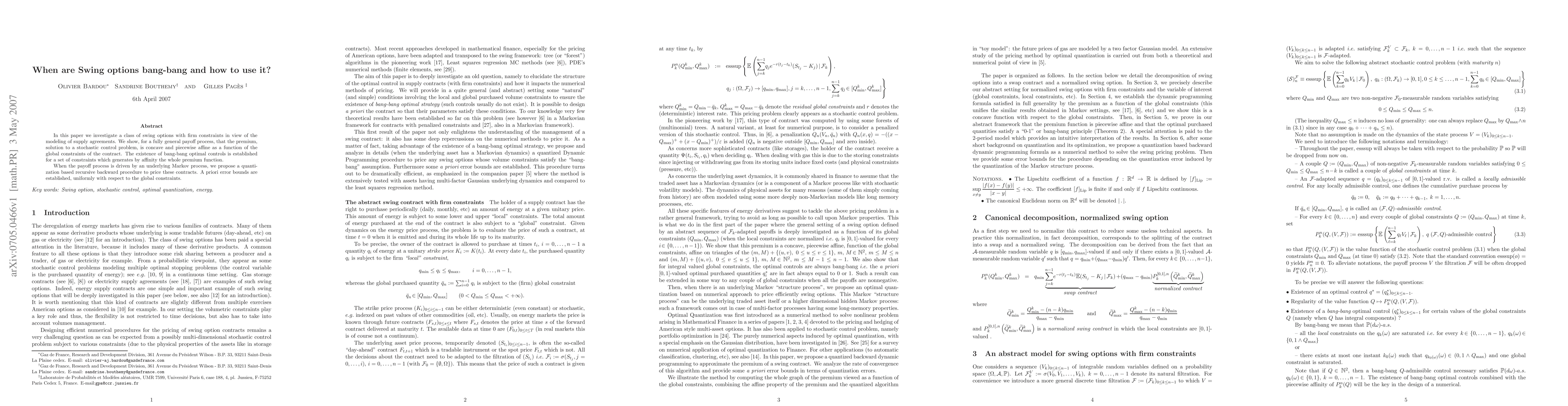 This paper explores swing options under firm constraints, demonstrating that the premium is concave and piecewise affine. It establishes the existence of bang-bang optimal controls for specific constraints and proposes a quantization-based recursive method for pricing, with established a priori error bounds.