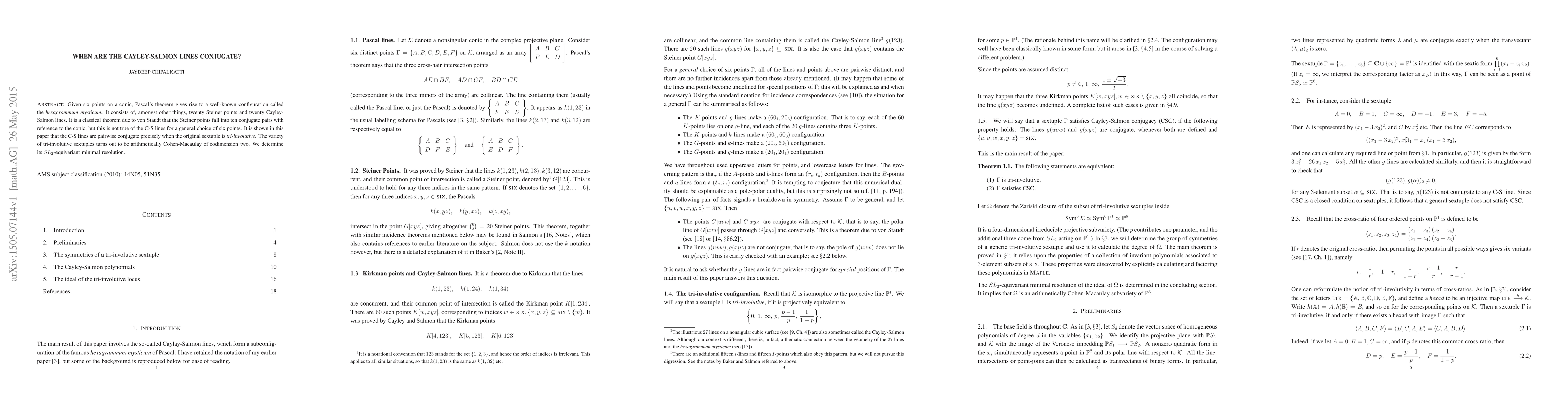Given six points on a conic, Pascal's theorem gives rise to a well-known configuration called the \emph{hexagrammum mysticum}. It consists of, amongst other things, twenty Steiner points and twenty Cayley-Salmon lines. It is a classical theorem due to von Staudt that the Steiner points fall into ten conjugate pairs with reference to the conic; but this is not true of the C-S lines for a general choice of six points. It is shown in this paper that the C-S lines are pairwise conjugate precisely when the original sextuple is~\emph{tri-involutive}. The variety of tri-involutive sextuples turns out to be arithmetically Cohen-Macaulay of codimension two. We determine its $SL_2$-equivariant minimal resolution.