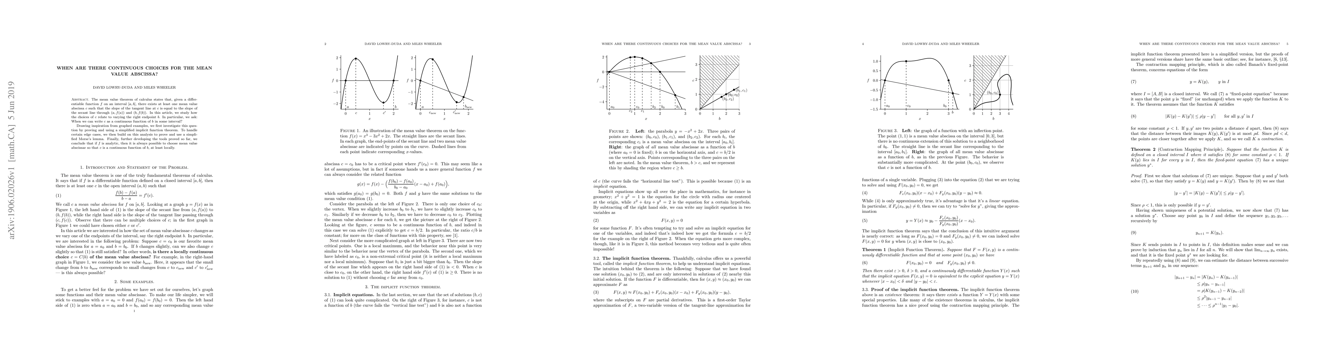 The mean value theorem of calculus states that, given a differentiable function $f$ on an interval $[a, b]$, there exists at least one mean value abscissa $c$ such that the slope of the tangent line at $c$ is equal to the slope of the secant line through $(a, f(a))$ and $(b, f(b))$. In this article, we study how the choices of $c$ relate to varying the right endpoint $b$. In particular, we ask: When we can write $c$ as a continuous function of $b$ in some interval? Drawing inspiration from graphed examples, we first investigate this question by proving and using a simplified implicit function theorem. To handle certain edge cases, we then build on this analysis to prove and use a simplified Morse's lemma. Finally, further developing the tools proved so far, we conclude that if $f$ is analytic, then it is always possible to choose mean value abscissae so that $c$ is a continuous function of $b$, at least locally.