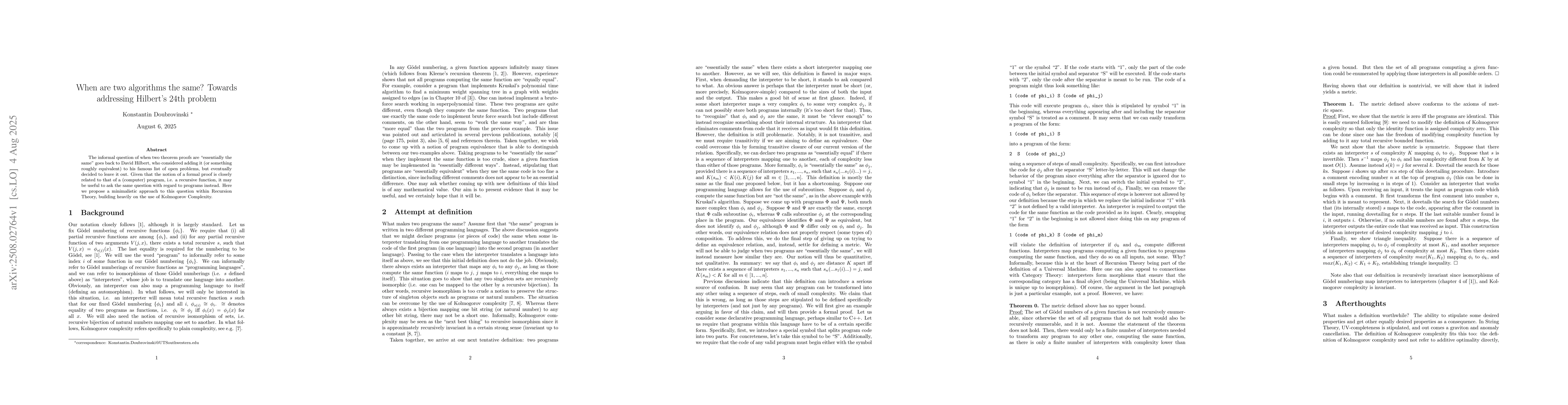 The informal question of when two theorem proofs are "essentially the same" goes back to David Hilbert, who considered adding it (or something largely equivalent) to his famous list of open problems, but eventually decided to leave it out. Given that the notion of a formal proof is closely related to that of a (computer) program, i.e. a recursive function, it may be useful to ask the same question with regard to programs instead. Here we propose a minimalistic approach to this question within Recursion Theory, building heavily on the use of Kolmogorov Complexity.