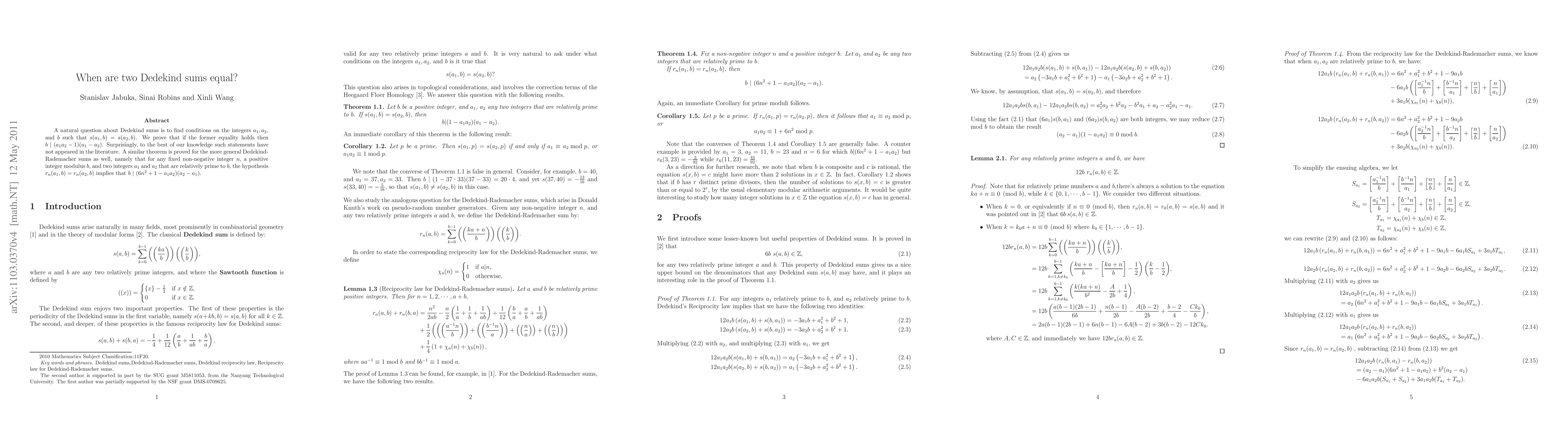Researchers found conditions under which two Dedekind sums are equal, revealing a surprising relationship between integers a, b, and the modulus b | (a1a2-1)(a1-a2) or b | (6n^2+1-a1a2)(a2-a1).