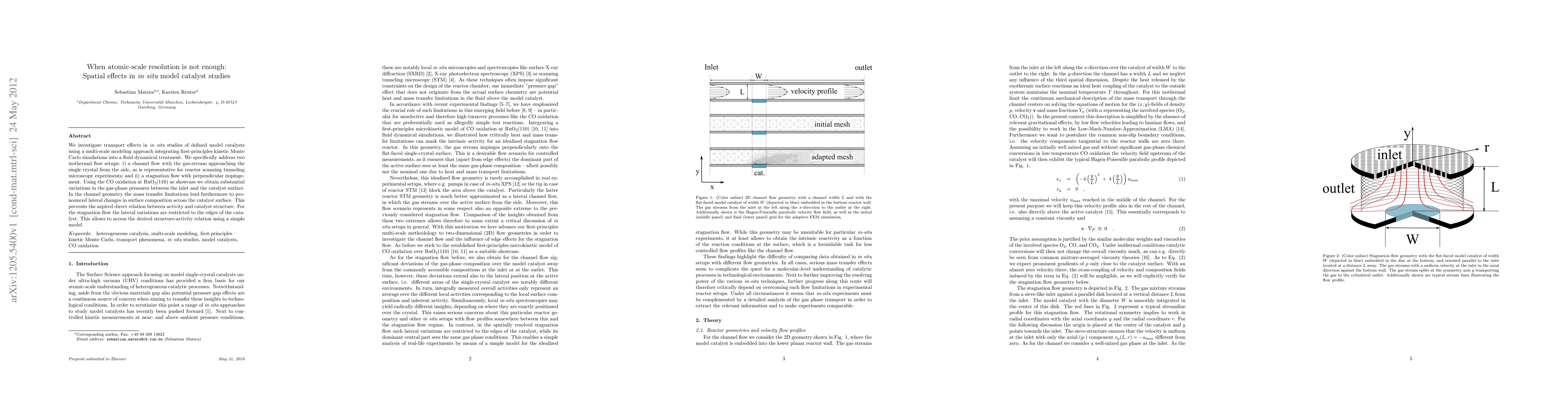 This paper explores transport effects in in situ model catalyst studies using multi-scale modeling, revealing significant variations in gas-phase pressures and lateral surface composition changes in channel flow, complicating direct activity-structure relations, while stagnation flow limits these variations to catalyst edges, allowing for clearer structure-activity correlations.