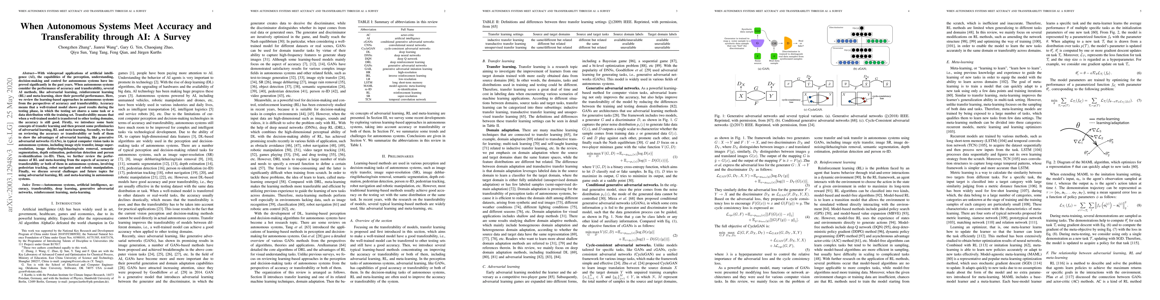A survey explores how artificial intelligence improves autonomous systems' accuracy and transferability in perception, decision-making, and control. The research highlights the strengths of adversarial learning, reinforcement learning, and meta-learning methods in achieving these goals.