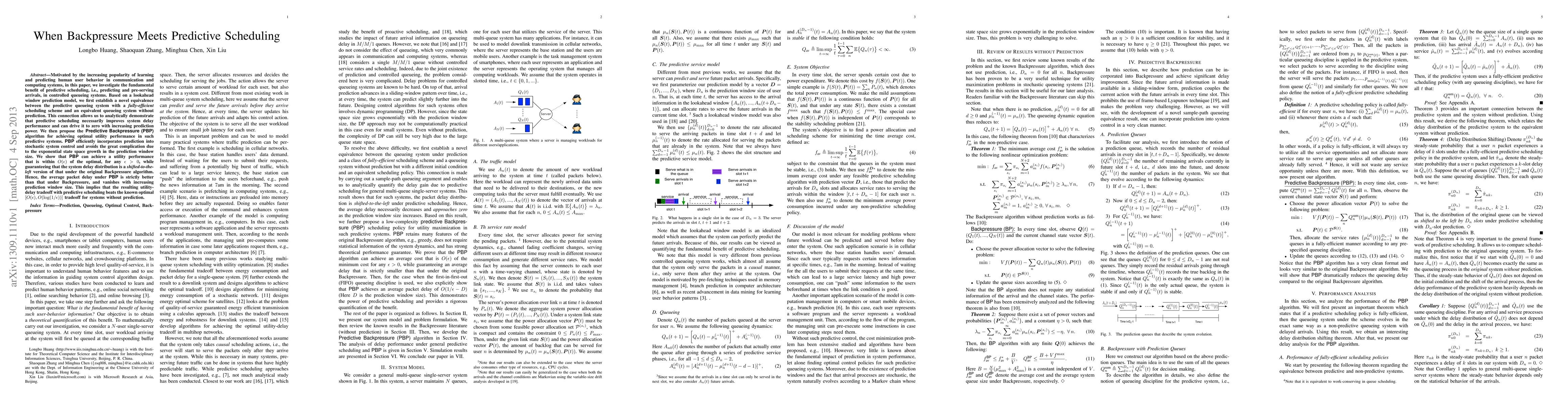 Motivated by the increasing popularity of learning and predicting human user behavior in communication and computing systems, in this paper, we investigate the fundamental benefit of predictive scheduling, i.e., predicting and pre-serving arrivals, in controlled queueing systems. Based on a lookahead window prediction model, we first establish a novel equivalence between the predictive queueing system with a \emph{fully-efficient} scheduling scheme and an equivalent queueing system without prediction. This connection allows us to analytically demonstrate that predictive scheduling necessarily improves system delay performance and can drive it to zero with increasing prediction power. We then propose the \textsf{Predictive Backpressure (PBP)} algorithm for achieving optimal utility performance in such predictive systems. \textsf{PBP} efficiently incorporates prediction into stochastic system control and avoids the great complication due to the exponential state space growth in the prediction window size. We show that \textsf{PBP} can achieve a utility performance that is within $O(\epsilon)$ of the optimal, for any $\epsilon>0$, while guaranteeing that the system delay distribution is a \emph{shifted-to-the-left} version of that under the original Backpressure algorithm. Hence, the average packet delay under \textsf{PBP} is strictly better than that under Backpressure, and vanishes with increasing prediction window size. This implies that the resulting utility-delay tradeoff with predictive scheduling beats the known optimal $[O(\epsilon), O(\log(1/\epsilon))]$ tradeoff for systems without prediction.