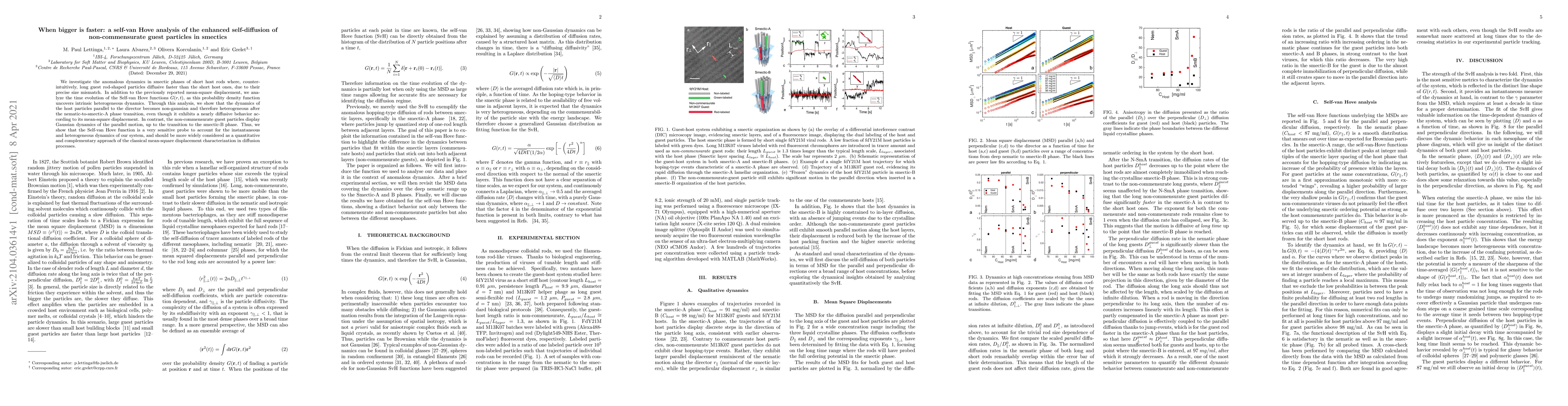 This paper investigates the anomalous diffusion of long guest particles in smectic phases of short host rods, revealing that the long particles diffuse faster due to size mismatch. The study uses Self-van Hove functions to show that host particles exhibit non-Gaussian, heterogeneous dynamics post-transition, while guest particles display Gaussian dynamics, highlighting the sensitivity of the Self-van Hove function in capturing instantaneous dynamics.