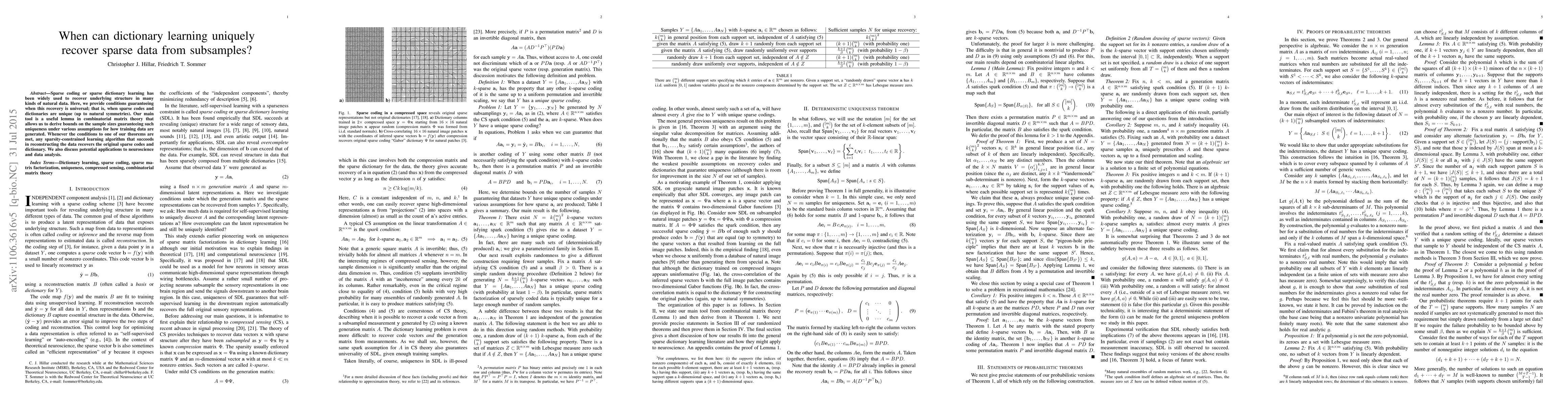 This paper establishes conditions under which sparse data representations can be uniquely recovered from limited samples, ensuring the original structure is identifiable. It uses combinatorial matrix theory to determine the sample sizes needed and discusses applications in neuroscience and data analysis.