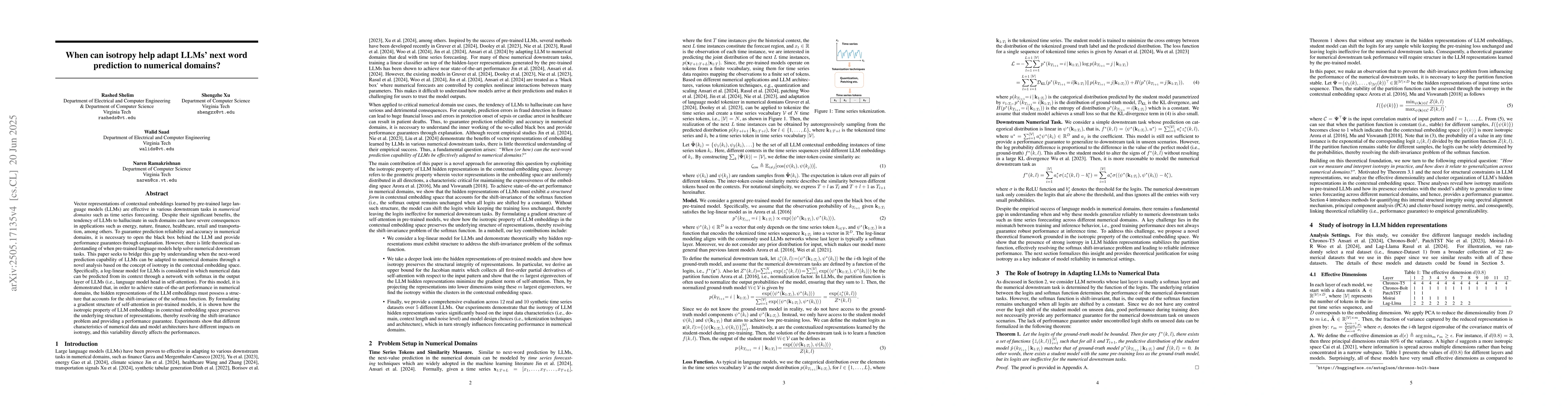 Recent studies have shown that vector representations of contextual embeddings learned by pre-trained large language models (LLMs) are effective in various downstream tasks in numerical domains. Despite their significant benefits, the tendency of LLMs to hallucinate in such domains can have severe consequences in applications such as energy, nature, finance, healthcare, retail and transportation, among others. To guarantee prediction reliability and accuracy in numerical domains, it is necessary to open the black-box and provide performance guarantees through explanation. However, there is little theoretical understanding of when pre-trained language models help solve numeric downstream tasks. This paper seeks to bridge this gap by understanding when the next-word prediction capability of LLMs can be adapted to numerical domains through a novel analysis based on the concept of isotropy in the contextual embedding space. Specifically, we consider a log-linear model for LLMs in which numeric data can be predicted from its context through a network with softmax in the output layer of LLMs (i.e., language model head in self-attention). We demonstrate that, in order to achieve state-of-the-art performance in numerical domains, the hidden representations of the LLM embeddings must possess a structure that accounts for the shift-invariance of the softmax function. By formulating a gradient structure of self-attention in pre-trained models, we show how the isotropic property of LLM embeddings in contextual embedding space preserves the underlying structure of representations, thereby resolving the shift-invariance problem and providing a performance guarantee. Experiments show that different characteristics of numeric data and model architecture could have different impacts on isotropy.
