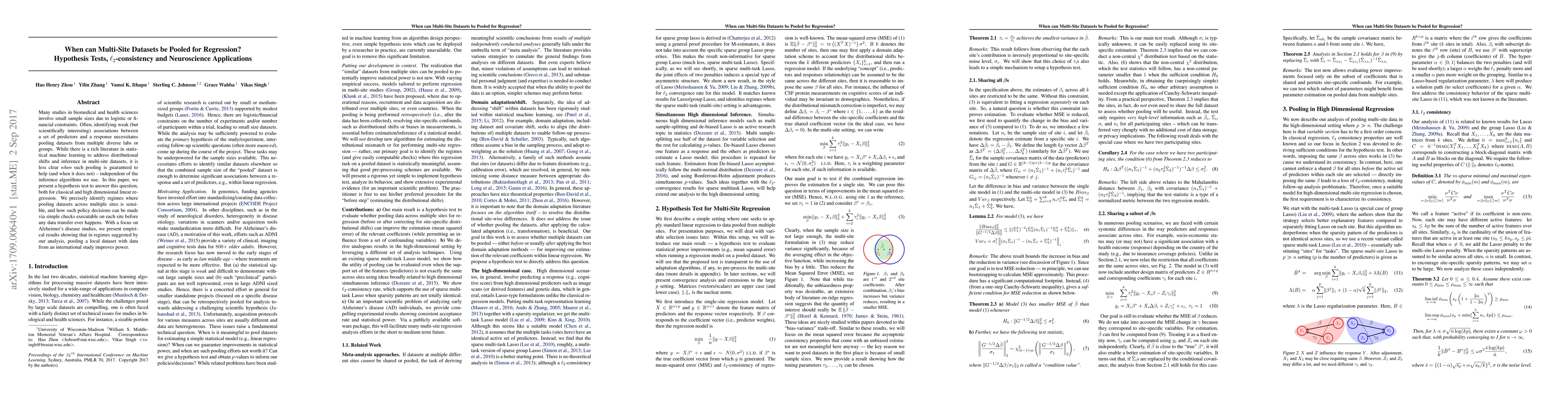 Many studies in biomedical and health sciences involve small sample sizes due to logistic or financial constraints. Often, identifying weak (but scientifically interesting) associations between a set of predictors and a response necessitates pooling datasets from multiple diverse labs or groups. While there is a rich literature in statistical machine learning to address distributional shifts and inference in multi-site datasets, it is less clear ${\it when}$ such pooling is guaranteed to help (and when it does not) -- independent of the inference algorithms we use. In this paper, we present a hypothesis test to answer this question, both for classical and high dimensional linear regression. We precisely identify regimes where pooling datasets across multiple sites is sensible, and how such policy decisions can be made via simple checks executable on each site before any data transfer ever happens. With a focus on Alzheimer's disease studies, we present empirical results showing that in regimes suggested by our analysis, pooling a local dataset with data from an international study improves power.